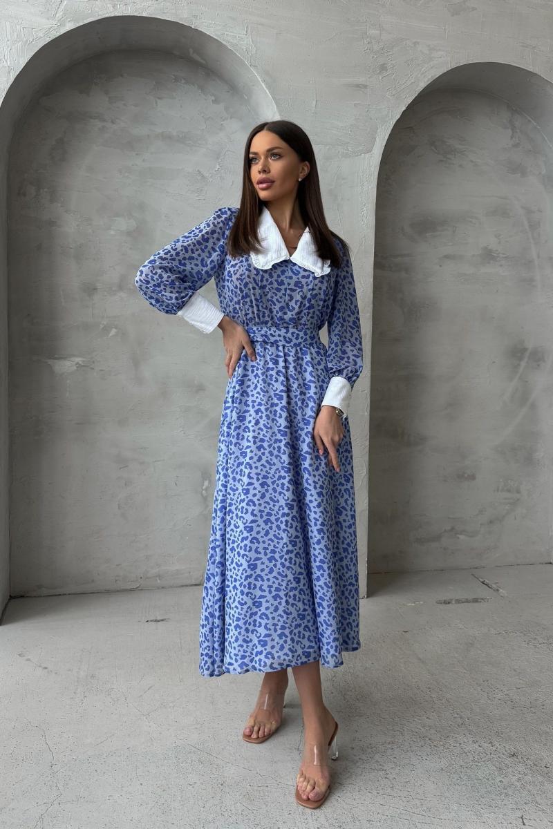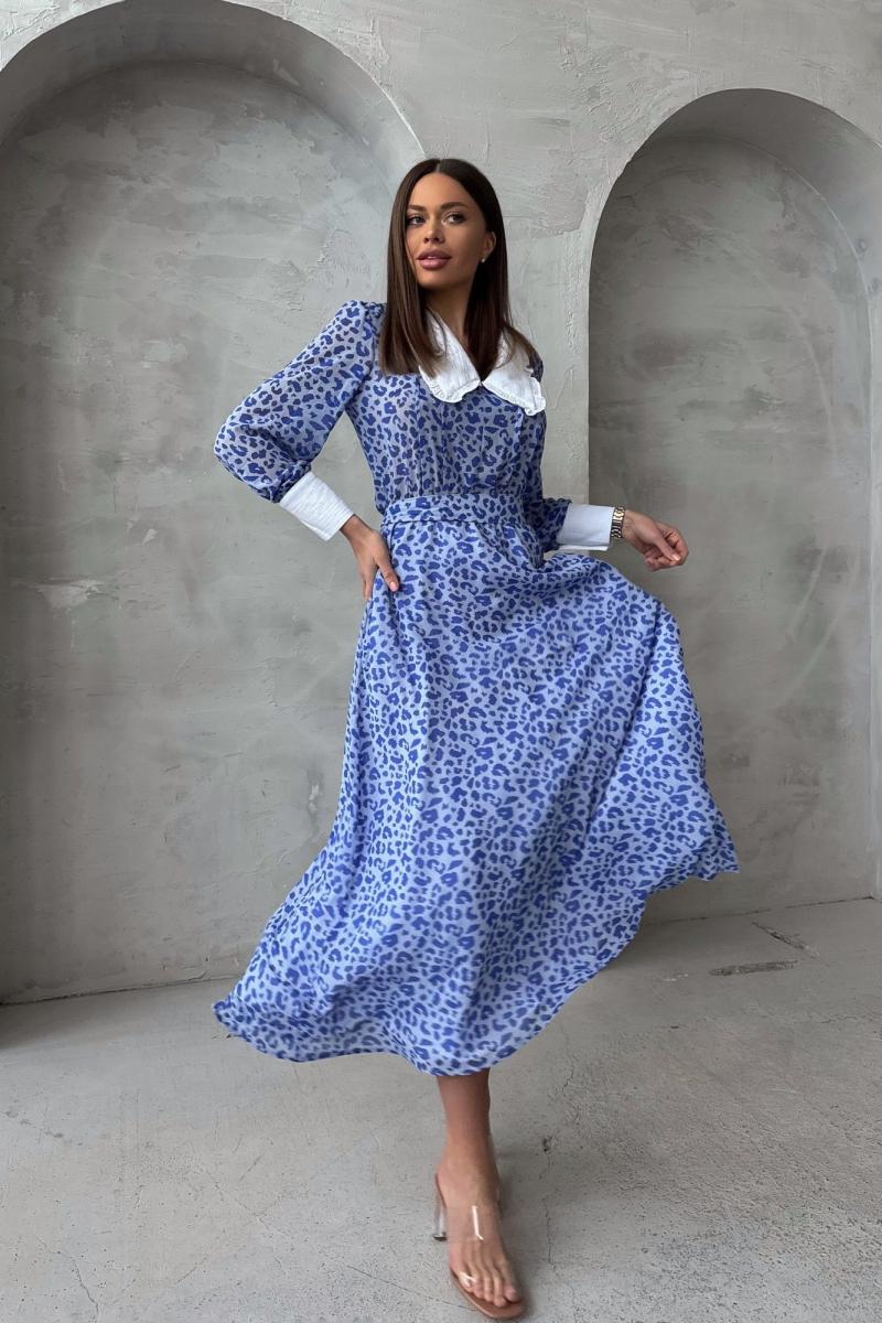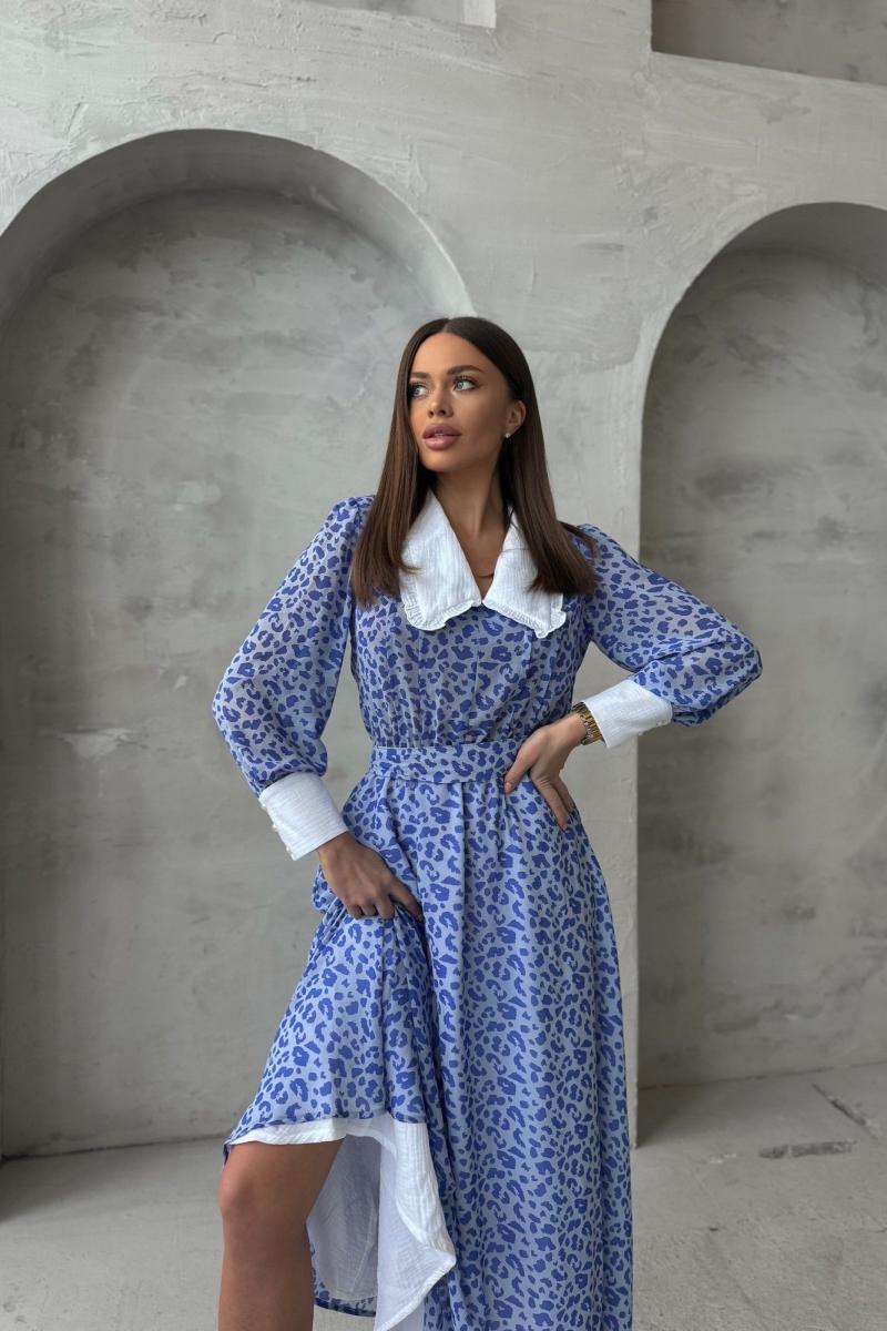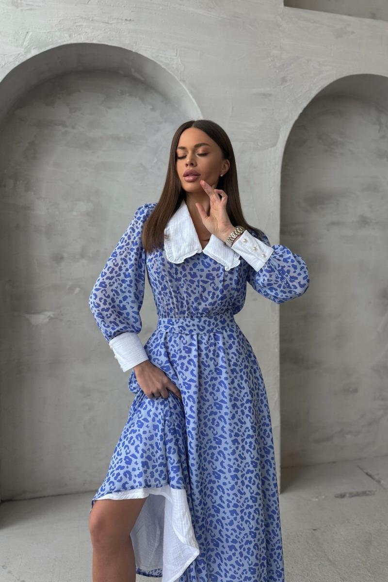 Шифоновое платье длинной миди. Подкладка 100% вискоза. Воротничок и манжеты из муслина. Объем по груди в 42-ом размере 94 см В 44-ом размере 98 см В 46-ом размере 102 см В 48-ом размере 106 см.