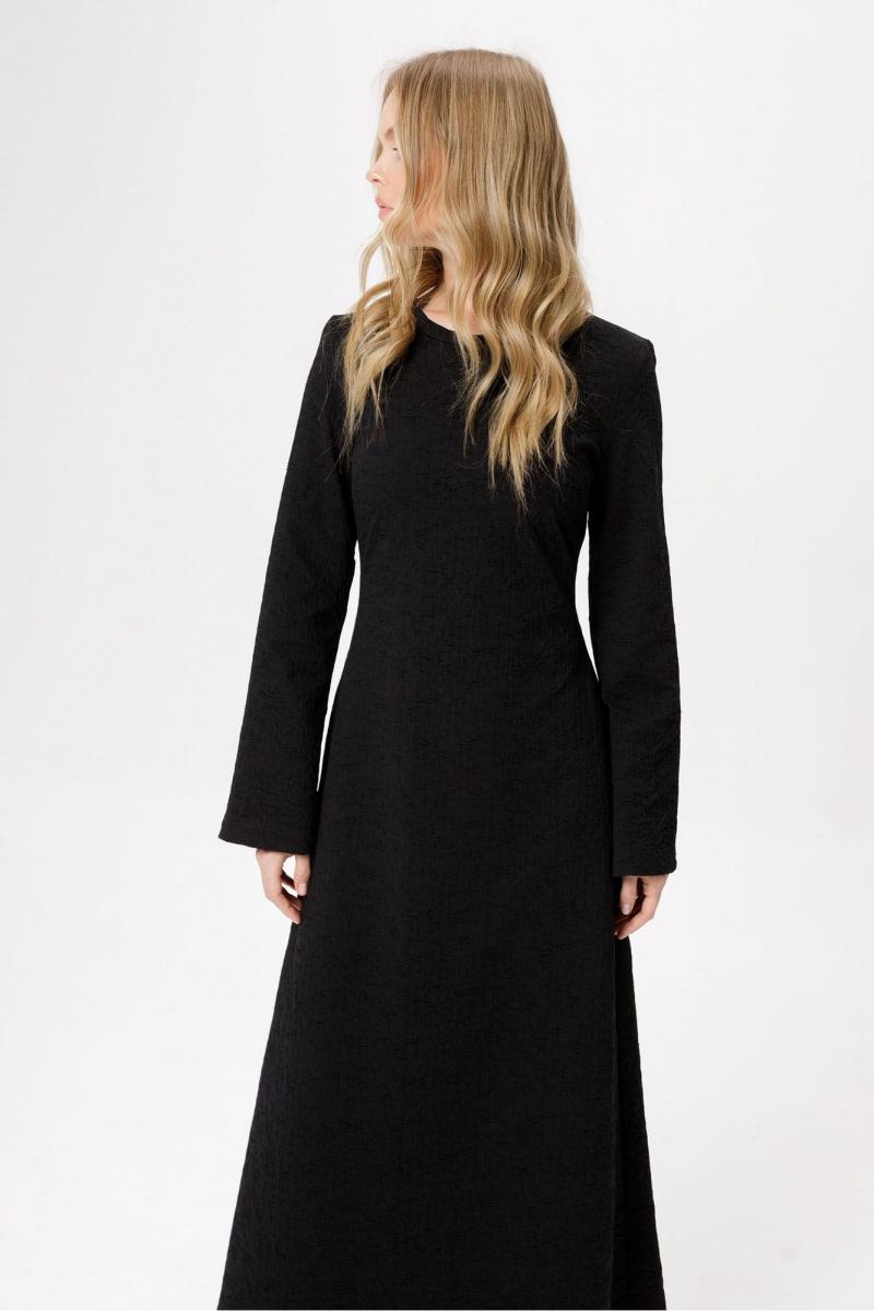 Трикотажное макси-платье со шнуровкой. Детали: полуприлегающий силуэт, нагрудные вытачки, талиевые вытачки по спинке, втачные удлиненные рукава. Длина платья по спинке 125 см, длина рукава около 62 см