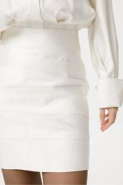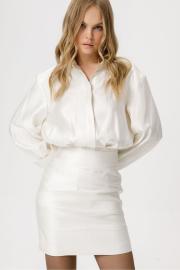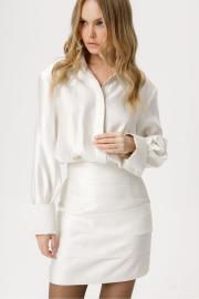 Детали: платье полуприлегающего силуэта, отрезное по талии с напуском, нижняя часть переда с ассиметричными складками, нижняя часть спинки с талиевыми вытачками, верхняя часть платья со складками на талии, рубашечный воротник, застёжка на потайную планку с пуговицами, потайная молния в боковом шве, рубашечный покрой рукава с расширенным плечом, широкие манжеты. Юбка платья на подкладке.