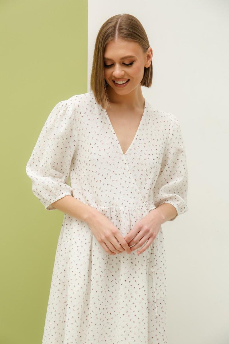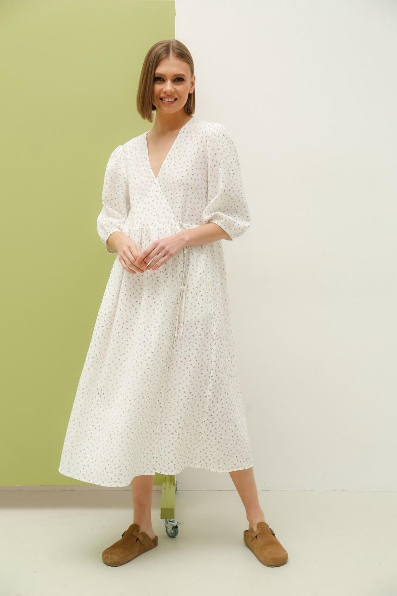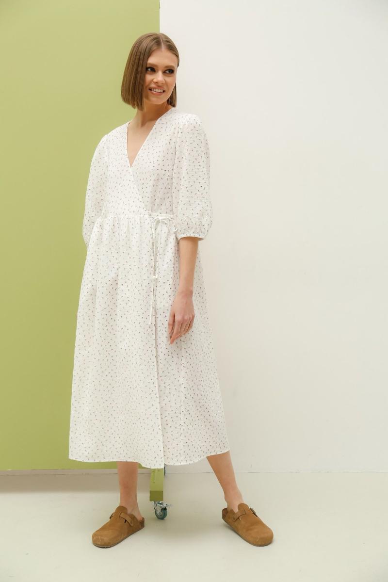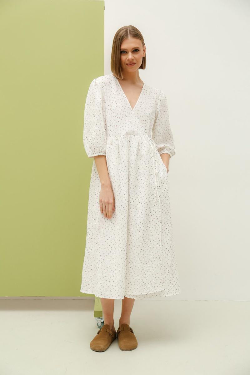 Романтичное платье , свободного силуэта на запах длиной миди. Платье отрезное по линии талии и сборкой по юбке. Рукав вточной одношовный 3/4 на резинке снизу. Длина изделия -119см. Длина рукава -40см.