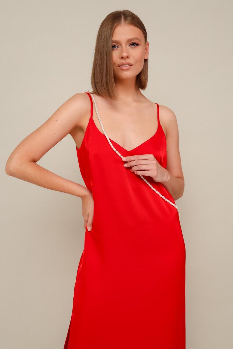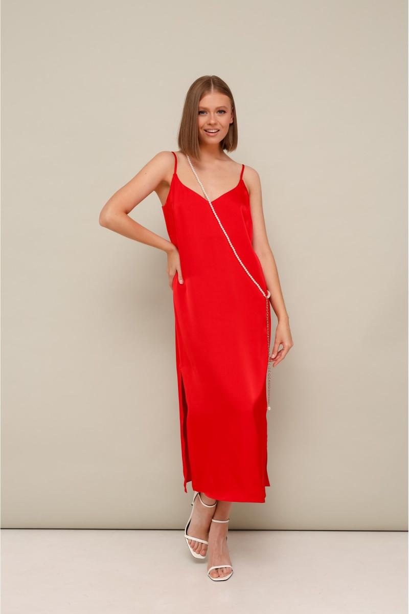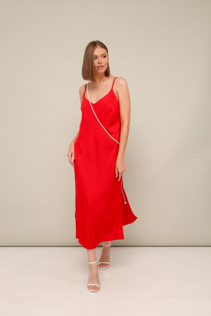Платье-комбинация полуприлегающего силуэта из струящейся ткани с благородным матовым блеском. Перед с нагрудными вытачками. В боковых швах по низу обработаны высокие разрезы. Бретели регулируются по длине. В комплекте к платью прилагается жемчужная цепочка. Платье без подкладки.