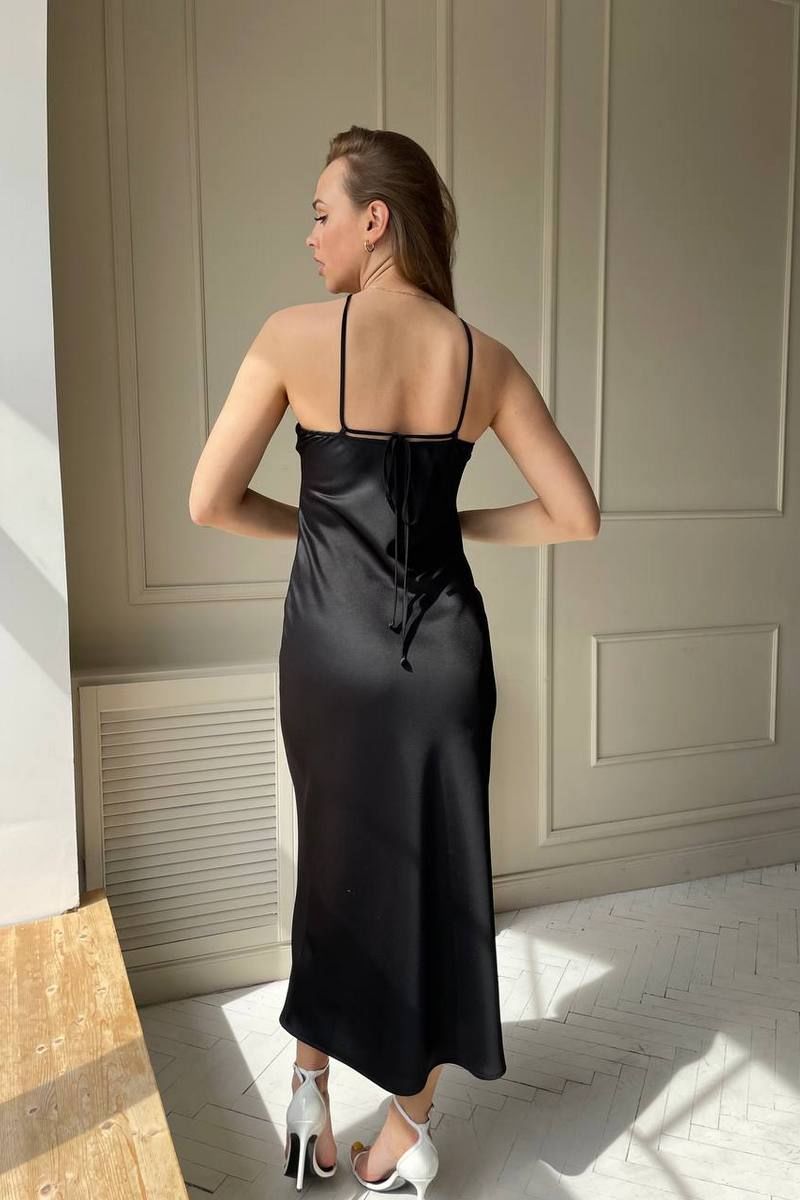 Платье-комбинация из плательного атласа, с окнантовкой на шее, которая завязывается как на шее, так и в виде бретелей регулируемых. Полуприлегающий силуэт, который подчеркивает все прелести женской фигуры. Материал неплотный, в то же время не выделяет возможные особенности фигуры. Длина от горловины 133 см. Длина от спинки 117 см.