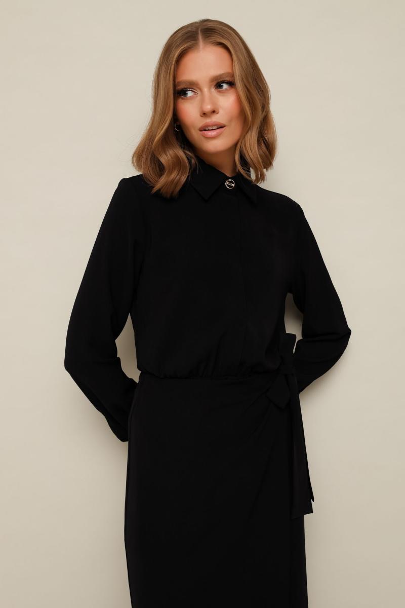 Платье отрезное по линии талии, полуприлегающего кроя, выполнено из плательной струящейся ткани. Горловина с рубашечным воротником на притачной стойке. Лиф с центральной застежкой на потайную планку на петли и пуговицы. По талии обработана резинка для регуляции размера. Юбка с имитацией запаха с застежкой на притачной пояс из основной ткани, который фиксируется на бант. Рукава длинные с притачной манжетой с застежкой на пуговицы.