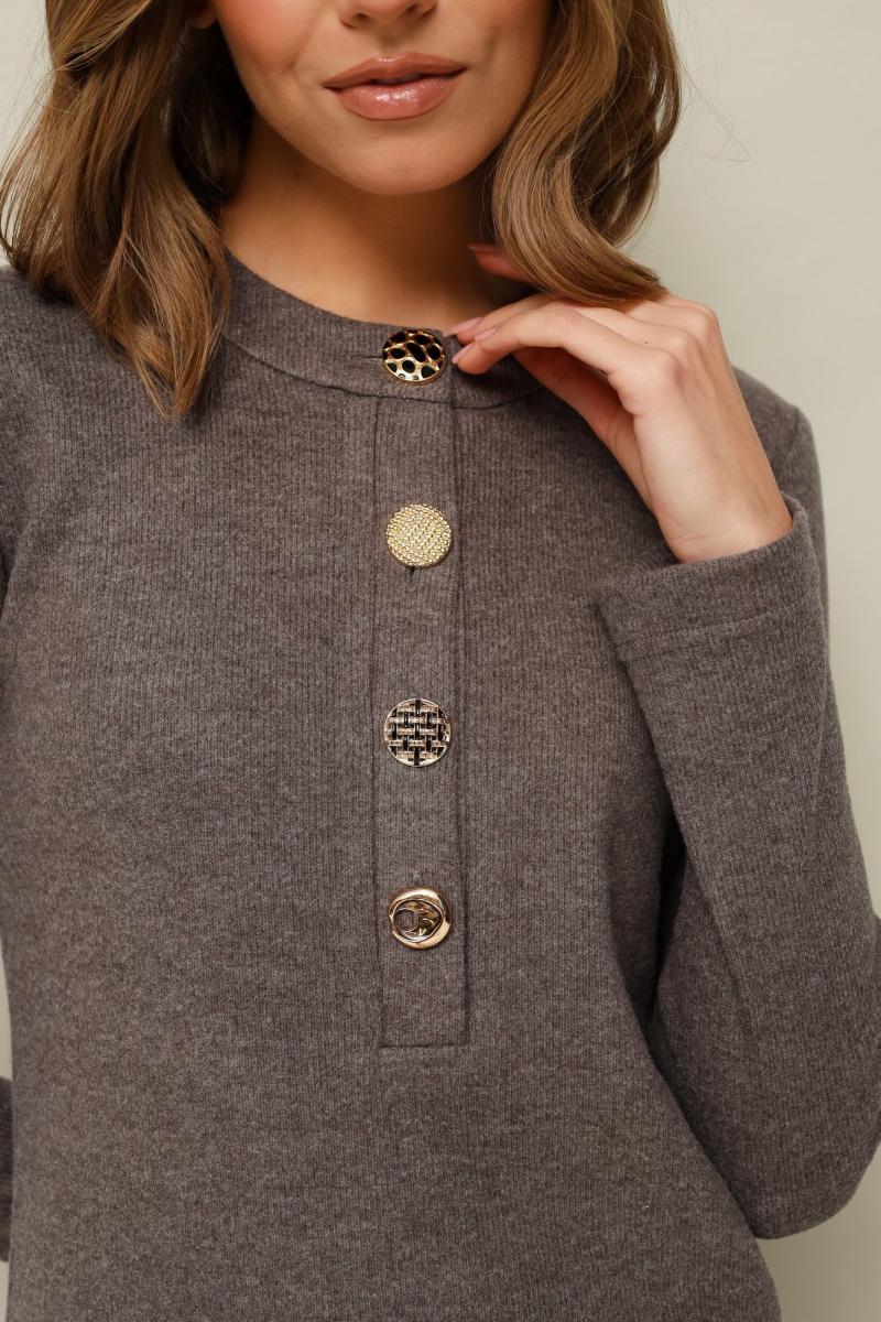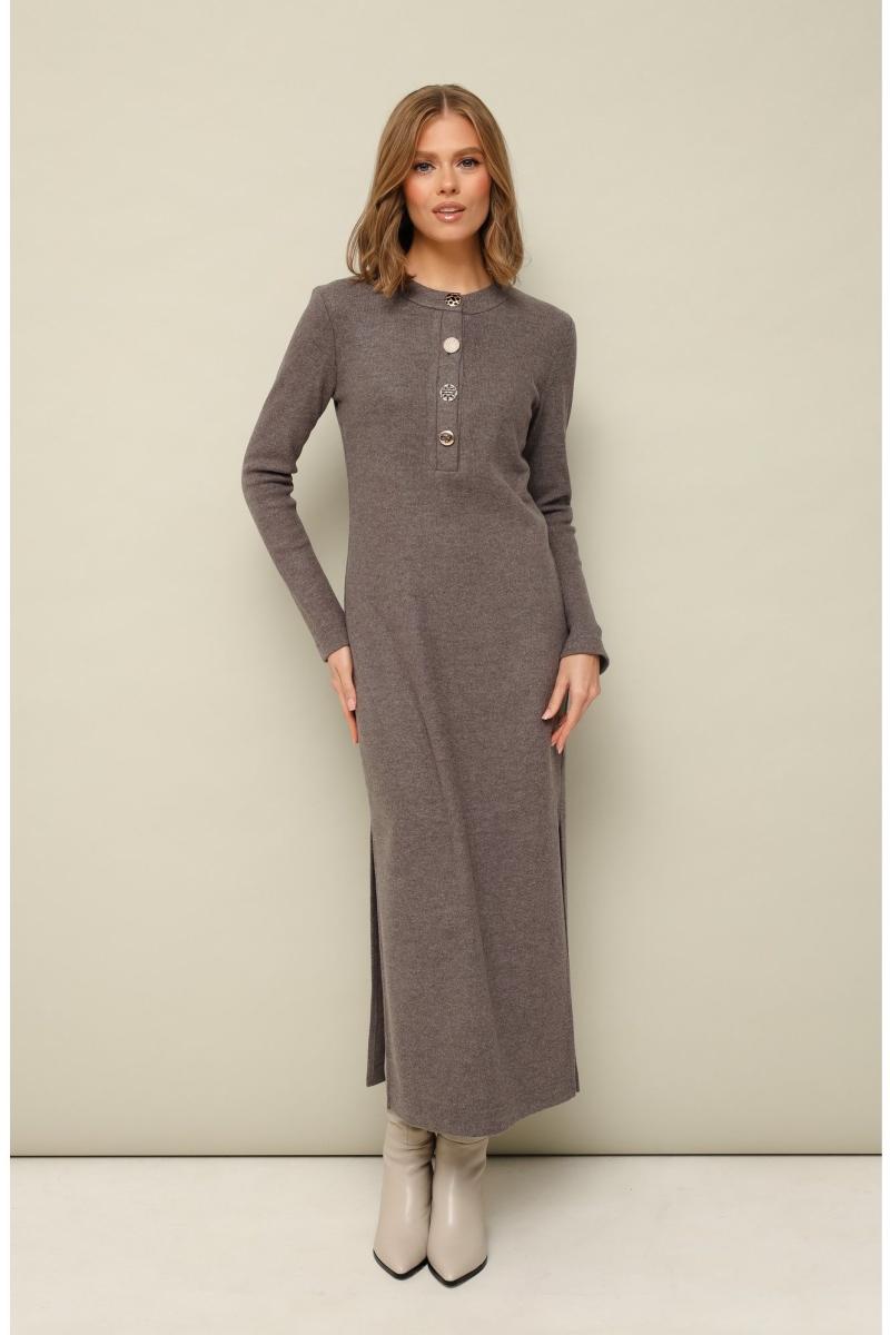 Стильное платье полуприлегающего силуэта, выполнено из трикотажного полотна. Горловина округлой формы, с центральной застежкой на петли и 4 разных пуговицы. Рукава длинные втачные. В боковых швах обработаны высокие разрезы.