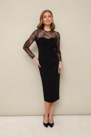 Платье-футляр прилегающего силуэта, отрезное по линии талии, в длине миди. Горловина округлая, вырез лифа фигурной формы с рельефами. Лиф и юбка выполнены из плательно-костюмной ткани. Рукава, кокетка лифа и спинки выполнены из кружевного полотна. Рукава длинные втачные. Акцентом платья является съемный воротничок, который застегивается на потайные пуговицы и навесные петли. Застежка на потайную тесьму-молнию в среднем шве спинки. Для удобства движения в нижней части юбки обработан разрез.