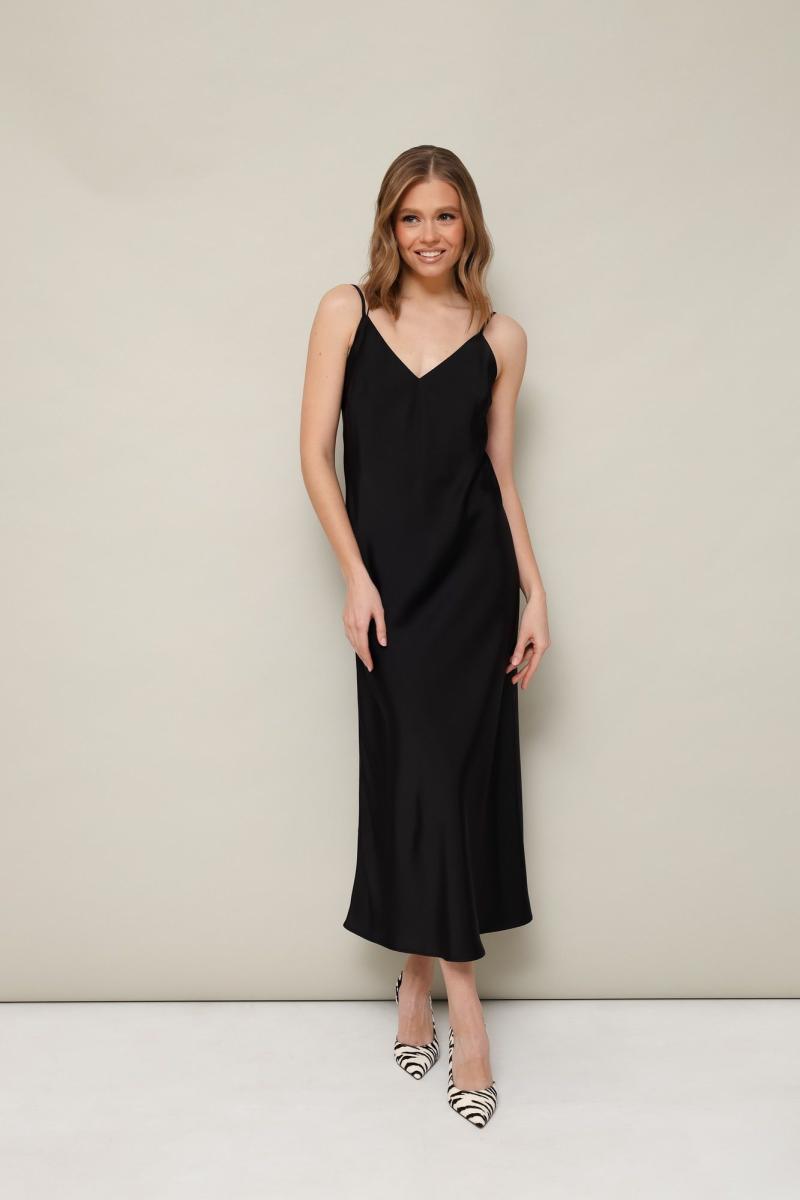 Платье-комбинация полуприлегающего силуэта, выполнено из струящейся ткани с матовым блеском. Крой по косой деликатно подчеркивает фигуру и скрывает недостатки. Основные бретельки регулируются по длине, декоративный шнур фиксируется на петлю по спинке. Платье без подкладки.