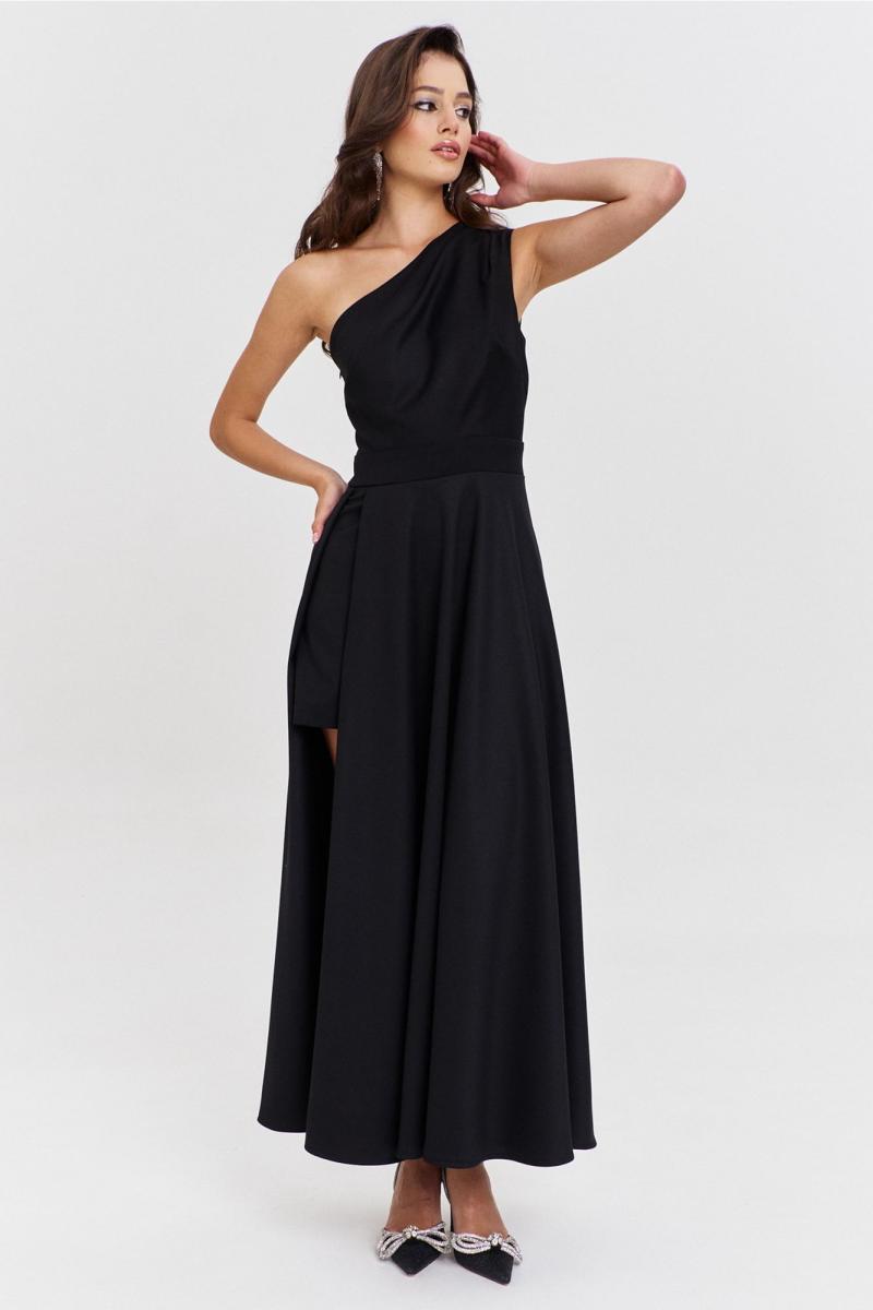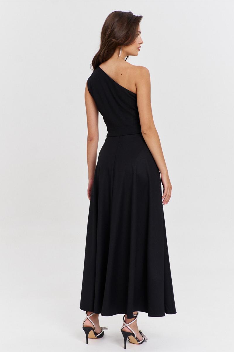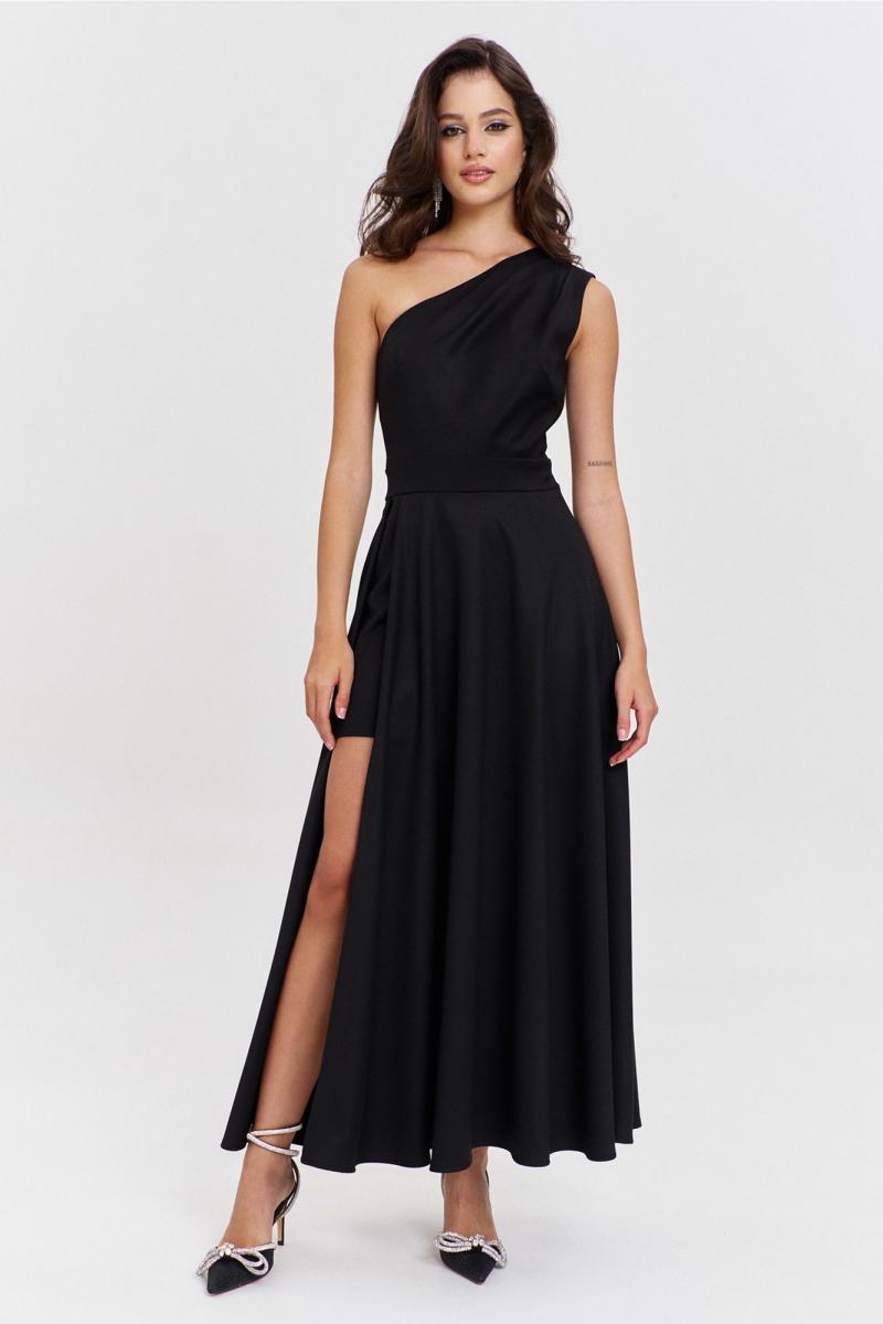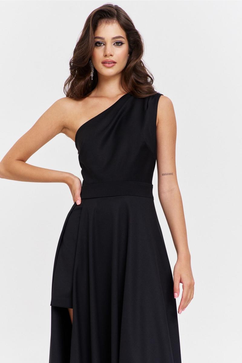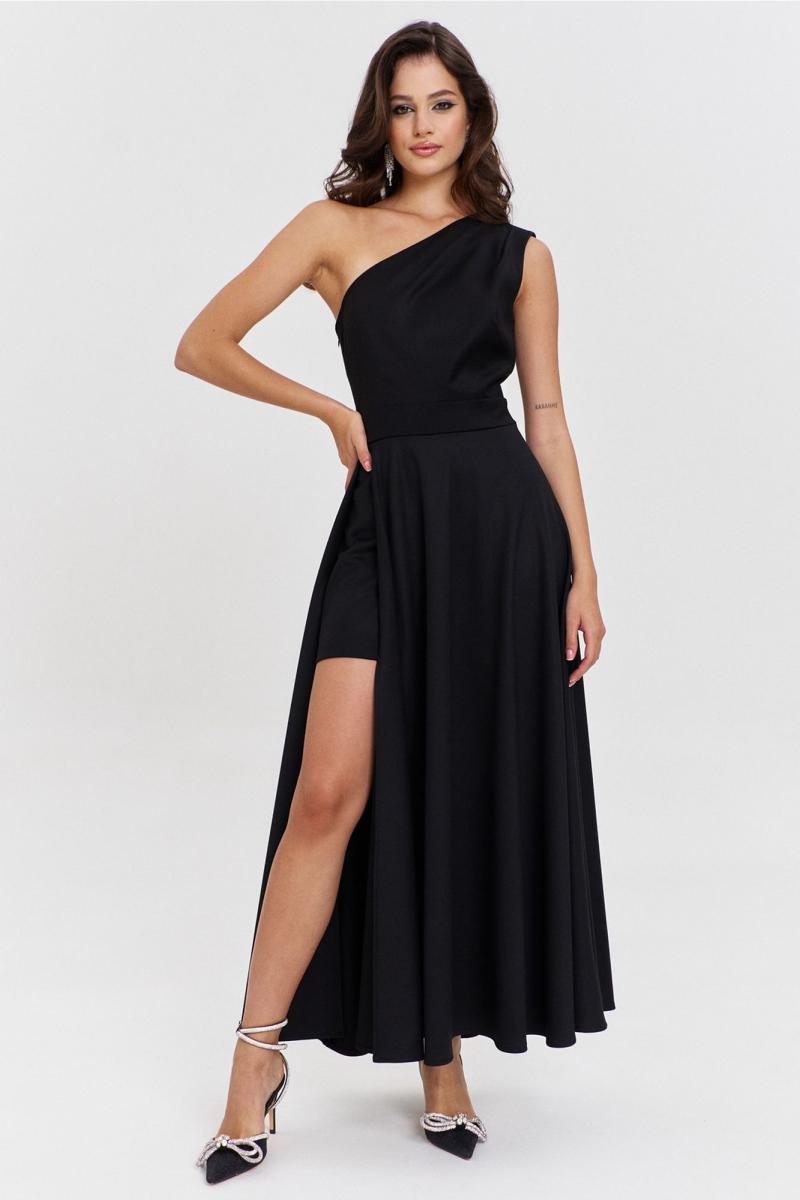 Платье полуприлегающего силуэта, длиной макси. Платье отрезное по лини талии с притачным поясом. Лиф выполнен на одно плечо, по спинке с талиевыми вытачками, по переду с нагрудными вытачками и односторонними складками от плеча. Юбка платья силуэта полусолнце. По спинке со средним швом, по переду с высоким разрезом. Платье дополнено шортами, притачанными к поясу. Шорты длиной выше середины бедра. В правом боковом шве обработана застежка на потайную тесьму-«молнию».