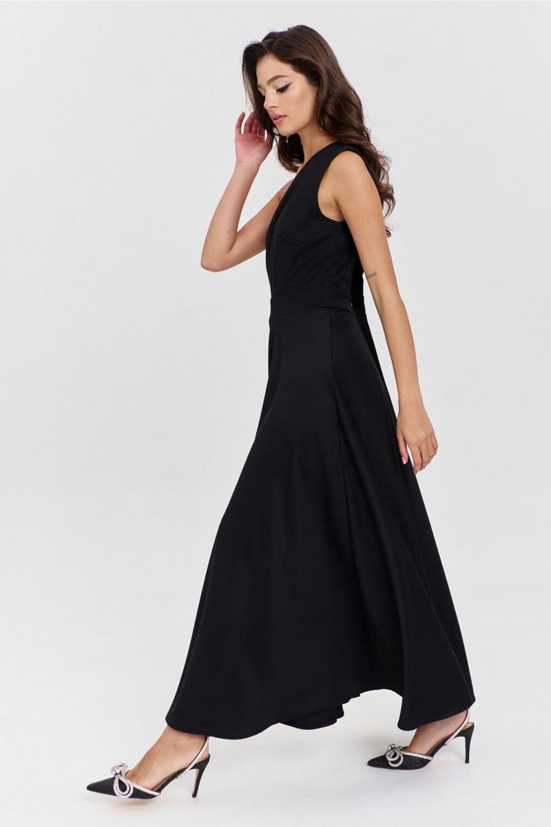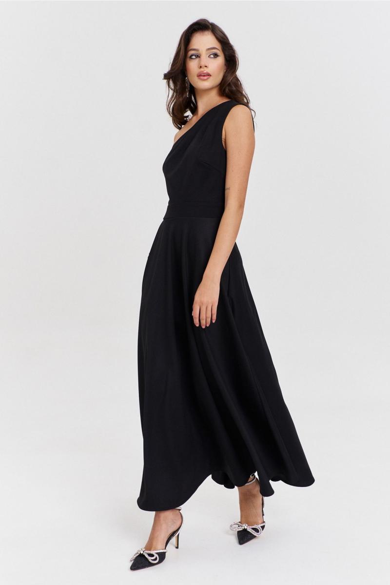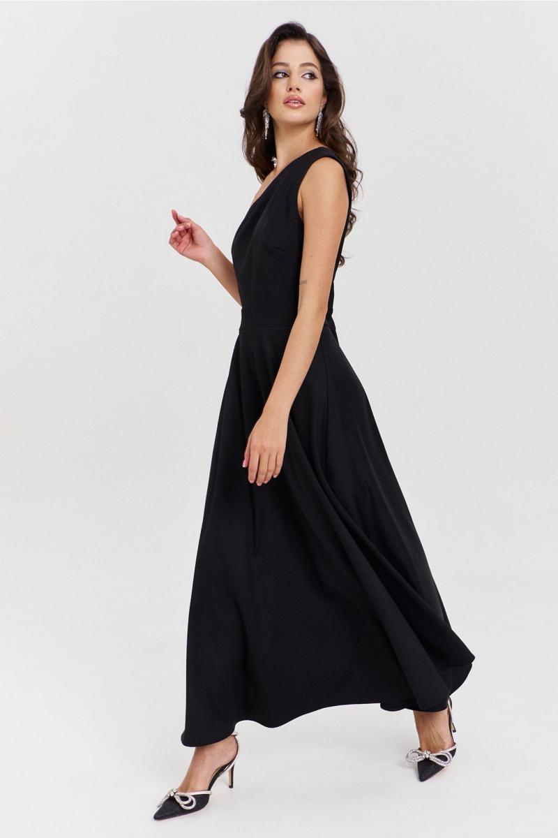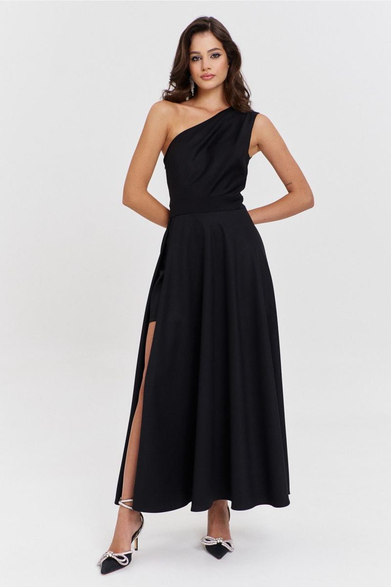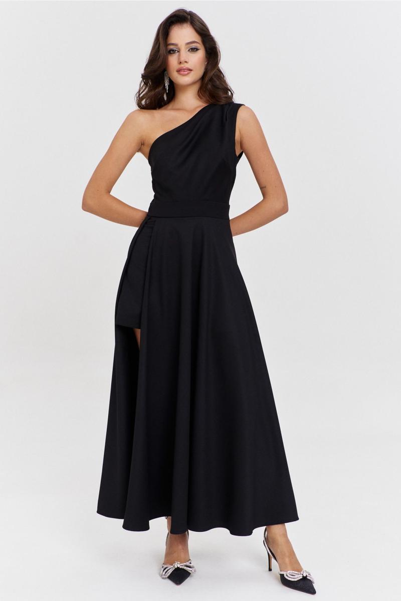Платье полуприлегающего силуэта, длиной макси. Платье отрезное по лини талии с притачным поясом. Лиф выполнен на одно плечо, по спинке с талиевыми вытачками, по переду с нагрудными вытачками и односторонними складками от плеча. Юбка платья силуэта полусолнце. По спинке со средним швом, по переду с высоким разрезом. Платье дополнено шортами, притачанными к поясу. Шорты длиной выше середины бедра. В правом боковом шве обработана застежка на потайную тесьму-«молнию».