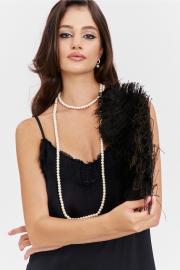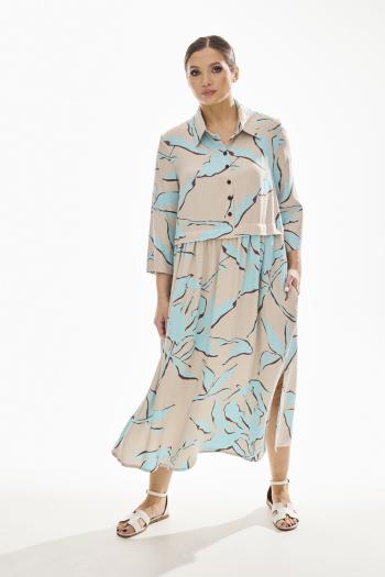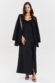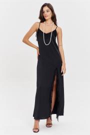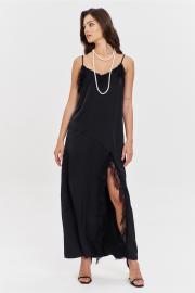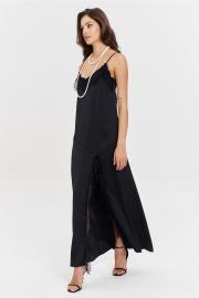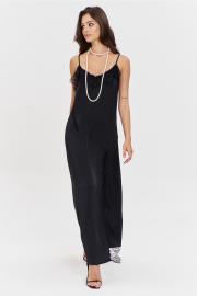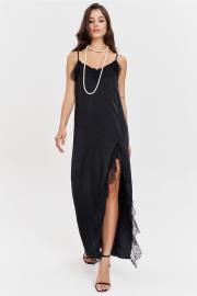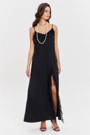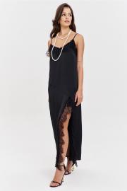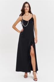 Платье свободного кроя, длиной макси. Платье на бретелях, которые регулируются по длине. Плате по спинке со средним швом. Платье по переду с ассиметричным подрезом. По нижней части переда с левой стороны обработан разрез. Платье декорировано кружевом по горловине переда и разрезу.