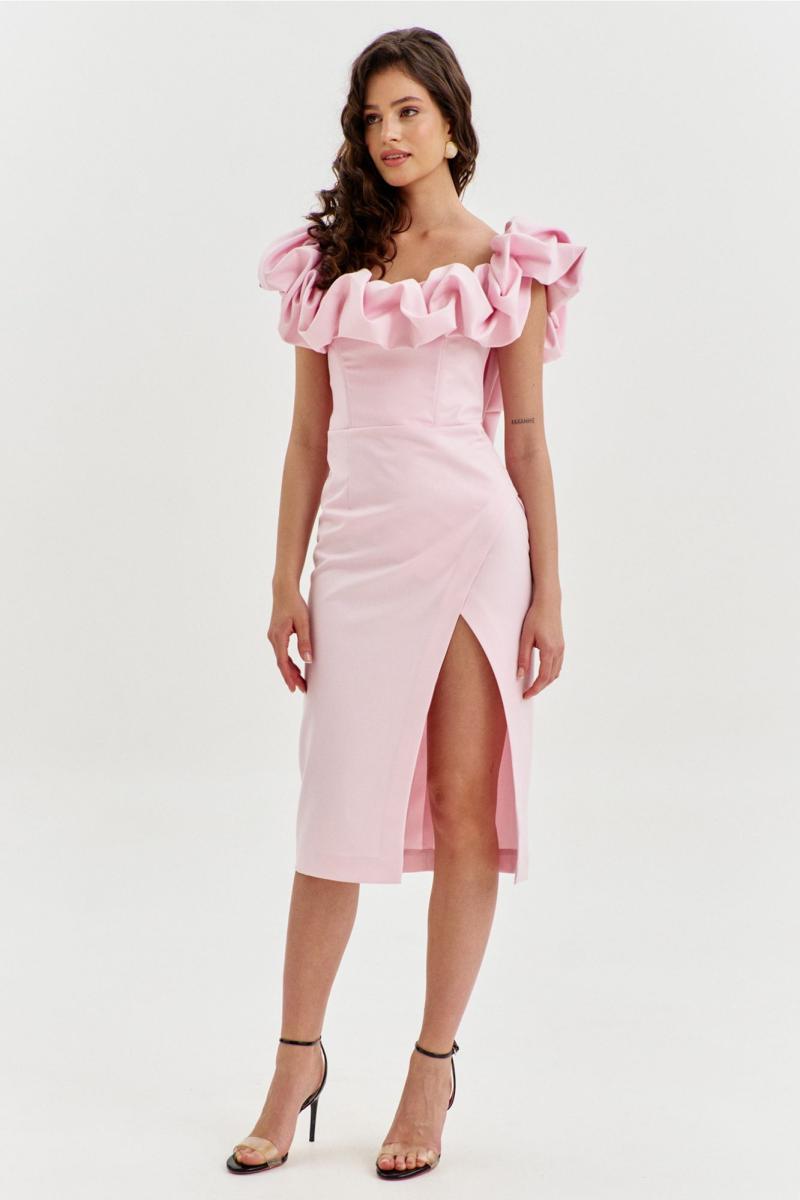Платье прилегающего силуэта, длиной до середины икры. Платье отрезное по линии талии. Лиф платья выполнен в виде корсета со шнуровкой по спинке. Юбка спинки с талиевыми вытачками и средним швом, в котором обработана застежка на потайную тесьму-«молнию». Юбка переда выполнена на запах с ассиметричным разрезом. Платье с объемным декором в области груди, рук и спинки.
