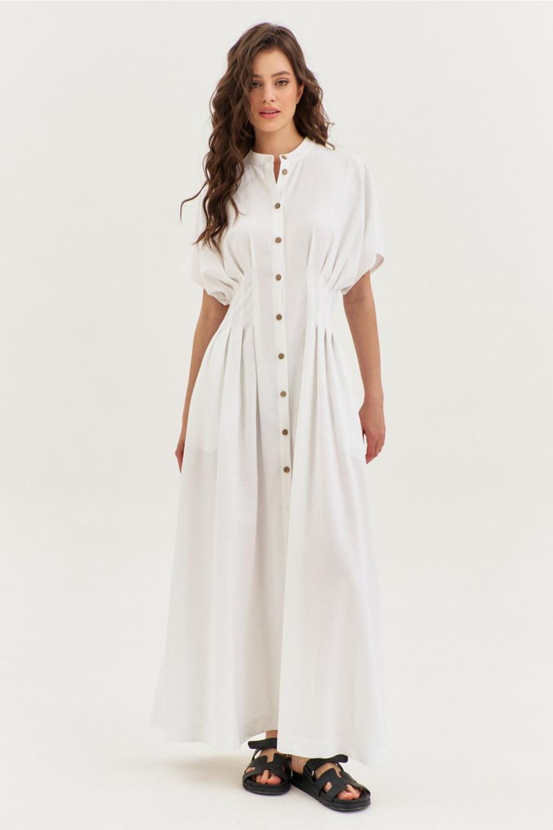 Платье полуприлегающего силуэта, расширенное к низу, длиной макси, с цельнокроеными рукавами. По талии застрочены складки. В боковых швах обработаны карманы. По переду застежка на петли и пуговицы. По горловине воротник-стойка.
