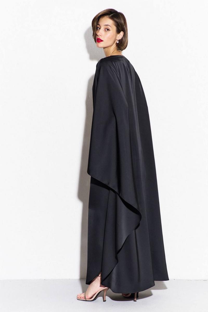 Платье свободного кроя: -платье расширенное к низу, длина макси -горловина округлой формы, без воротника -платье ассиметричное: с левой стороны рукав цельнокроеный «летучая мышь», с правой стороны – втачной, длинный рукав -с левой стороны платья, в области бокового обработан разрез.