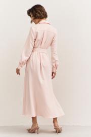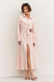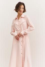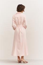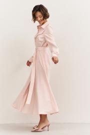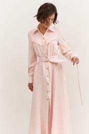 Платье свободного кроя: -длина до щиколотки, расширено к низу -воротник рубашечного типа -карманы в боковых швах -рукава длинные, одношовные, втачные -по переду на манжете застежка на кнопки -в комплекте сьемный пояс .
