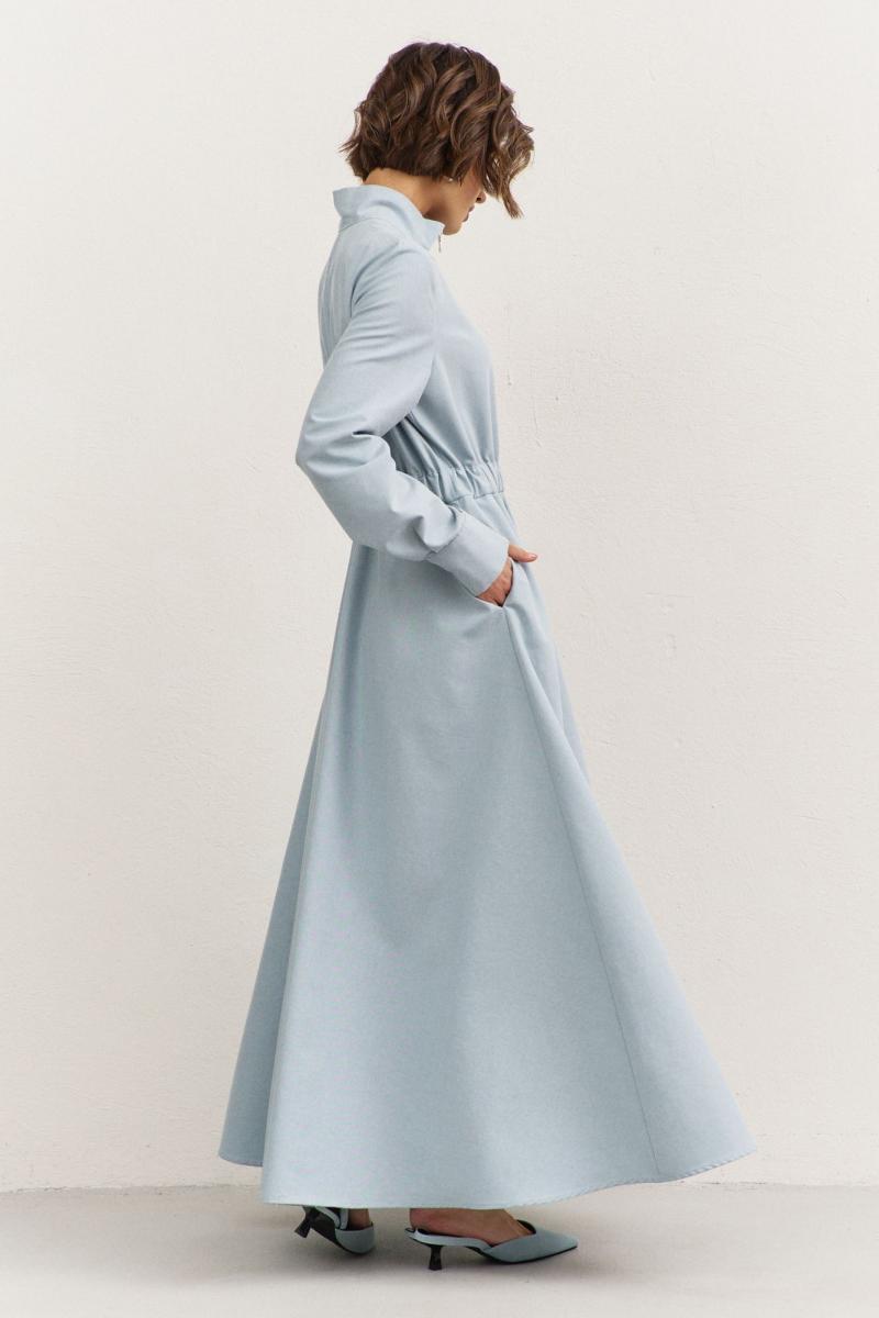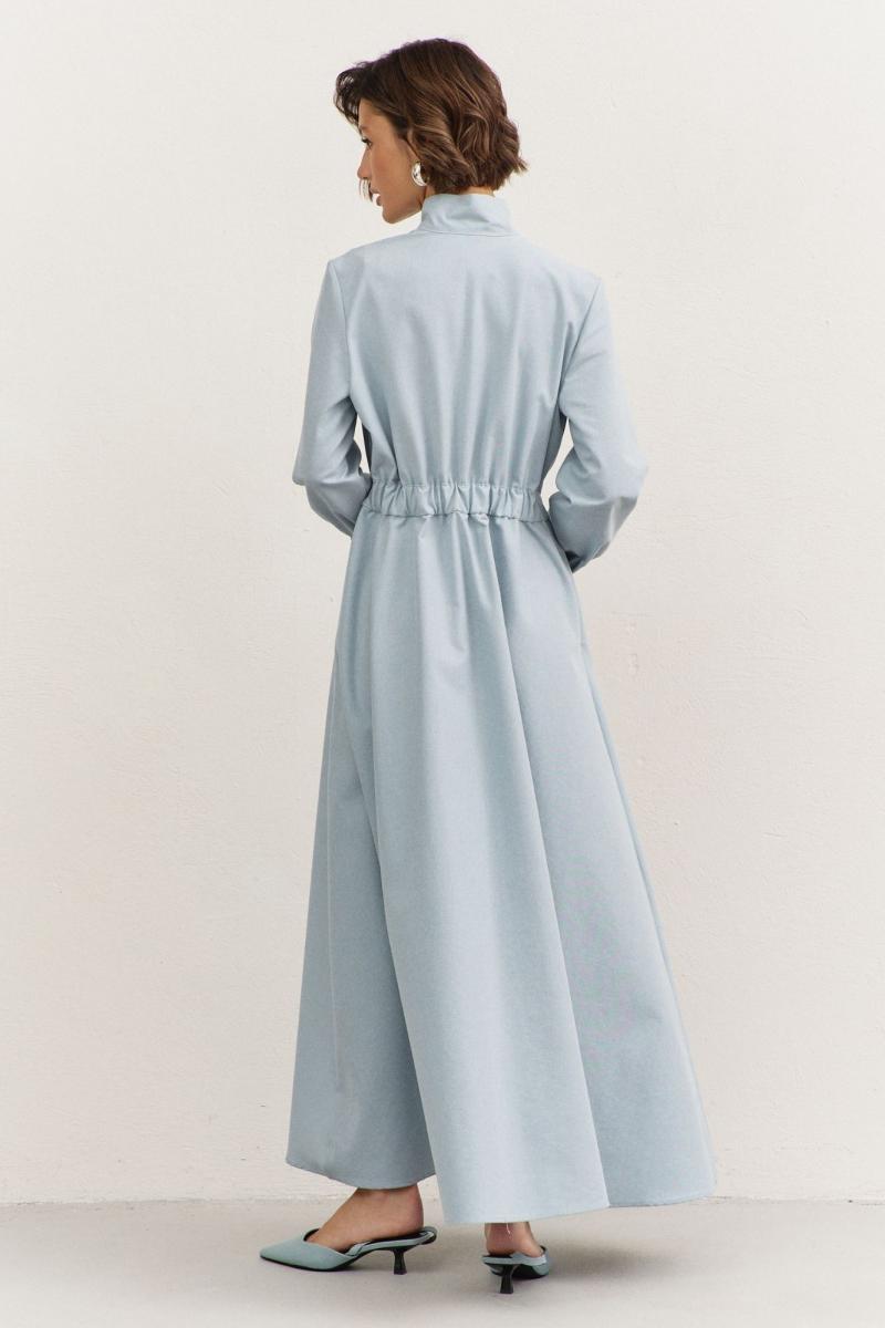 Платье полуприлегающего силуэта: • воротник-стойка • по переду кокетка • отрезное по линии талии • по талии кулиса с резинкой • юбка А-образного силуэта • застежка на молнию • в боковых швах карманы • рукава втачные, длинные с притачной манжетой • манжеты с застежкой на кнопки • длина макси