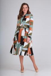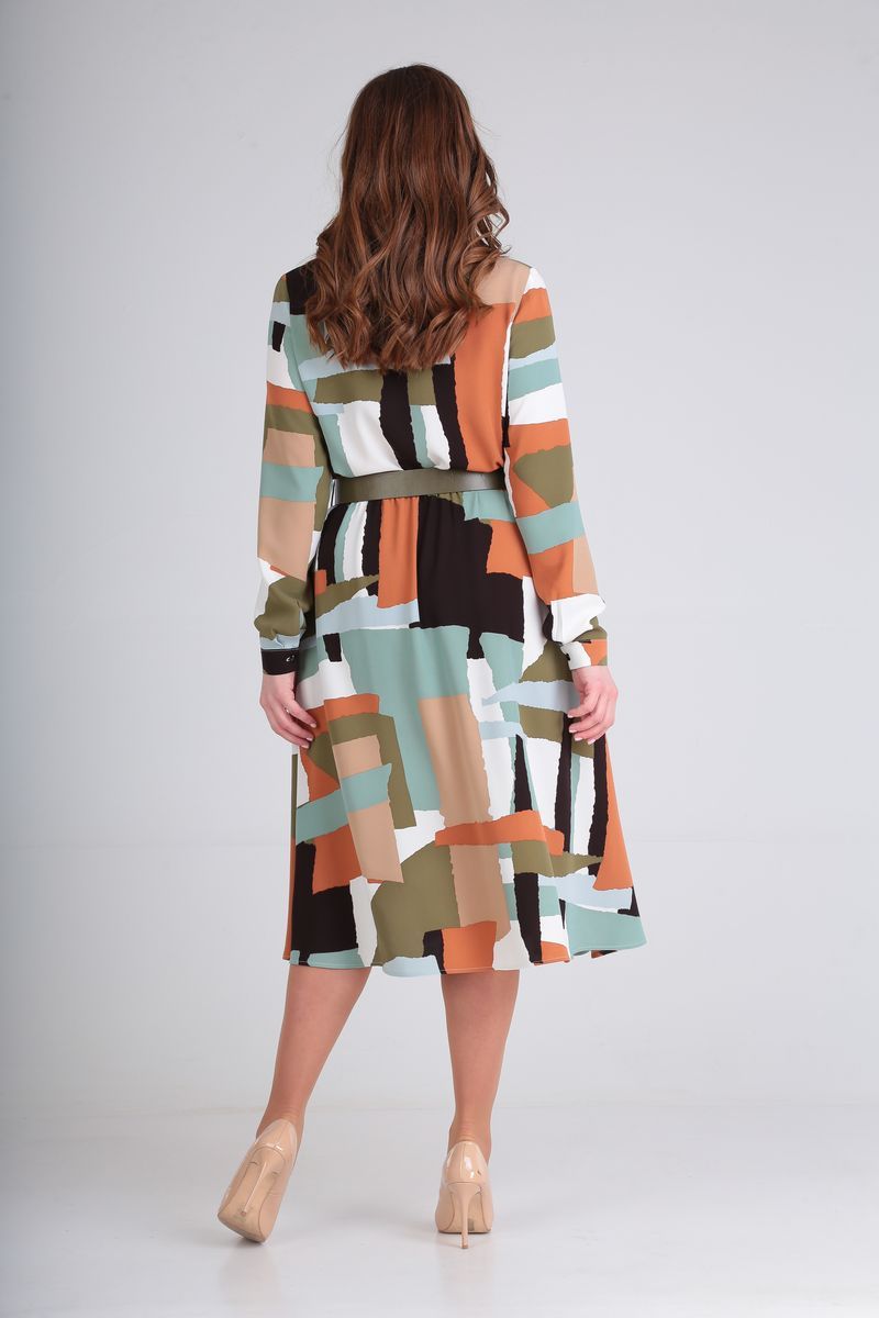 Платье из ткани с геометрическим принтом, по линии талии отрезное и присборено на резинку, расширенное к низу. Лиф с центральной бортовой застежкой на петли и пуговицы. В боковых швах юбки расположены карманы. Рукав втачной одношовный, с притачной манжетой с застежкой на пуговицу. Вырез горловины круглый с воротником на стойке рубашечного типа. По линии талии платье перехвачено декоративным поясом из искусственной кожи. Длина по спинке - 115. Длина рукава - 65.