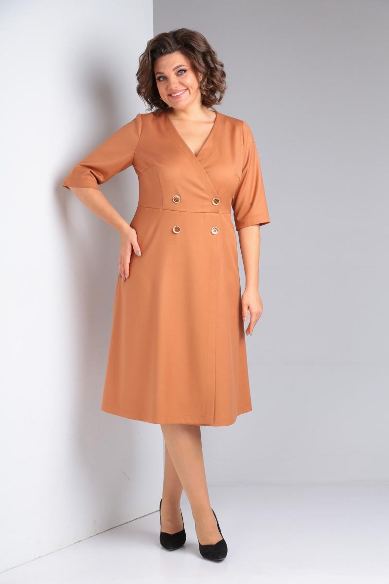 Платье из костюмной ткани, прилегающего силуэта, отрезное по линии талии, с карманами в боковых швах. Перед с нагрудными и талиевыми вытачками, запахом с имитацией застежки на пуговицы. Спинка с талиевыми вытачками. Рукав втачной одношовный. Вырез горловины V-образный. Длина по спинке 110. Длина рукава 37.