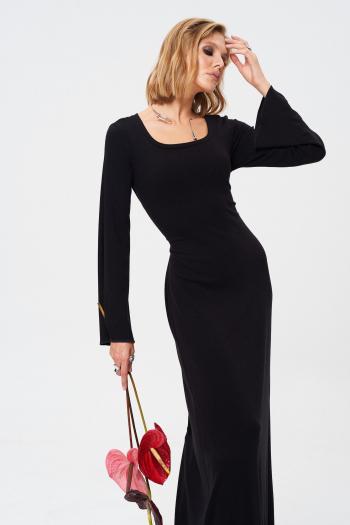 Уютное платье-свитер из плотного трикотажа. Свободный покрой с длинным рукавом со спущенной проймой. Воротник стойка, высокий разрез с одной стороны. Платье без застежки. Длина платья 131 см Длина рукава 71 см