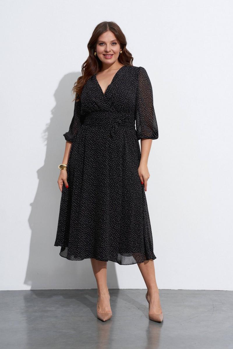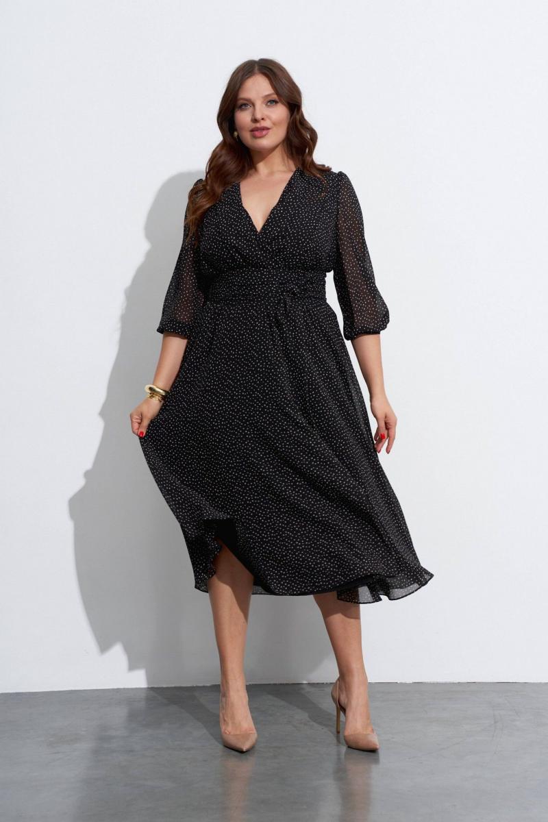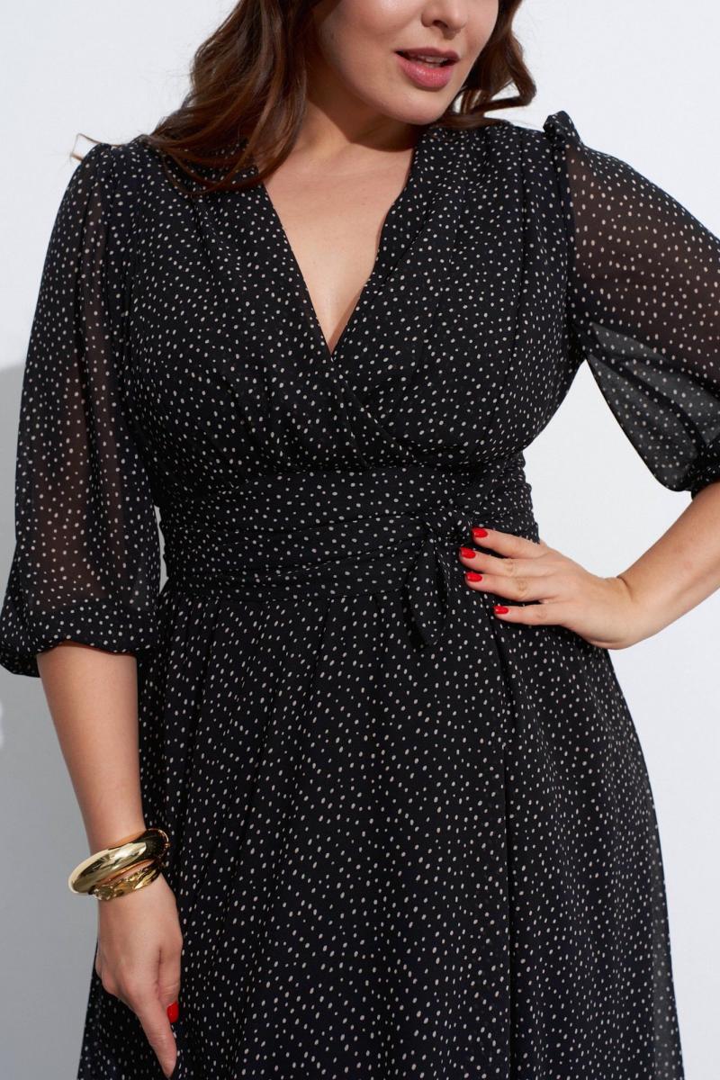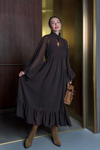 Платье из шифона с отрезным лифом и разведённым низом. Лиф переда выполнен запашным из присборенных у плеча и в талии деталей. Нижние детали платья также с запахом. Платье можно подвязывать поясом. Рукава в ¾ длины, сверху присборены и снизу собраны на эластичную тесьму. Изделие на лёгкой подкладке. Длина по спинке ок. 124 см. в 52м.