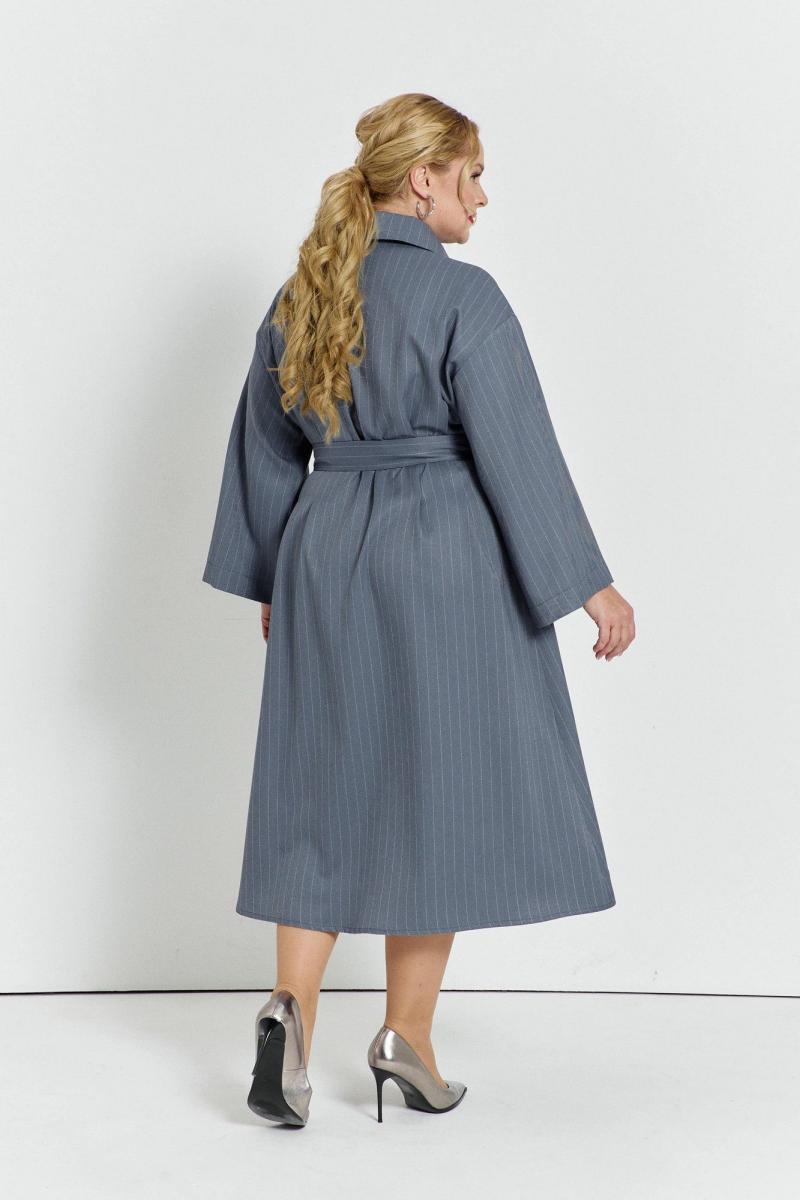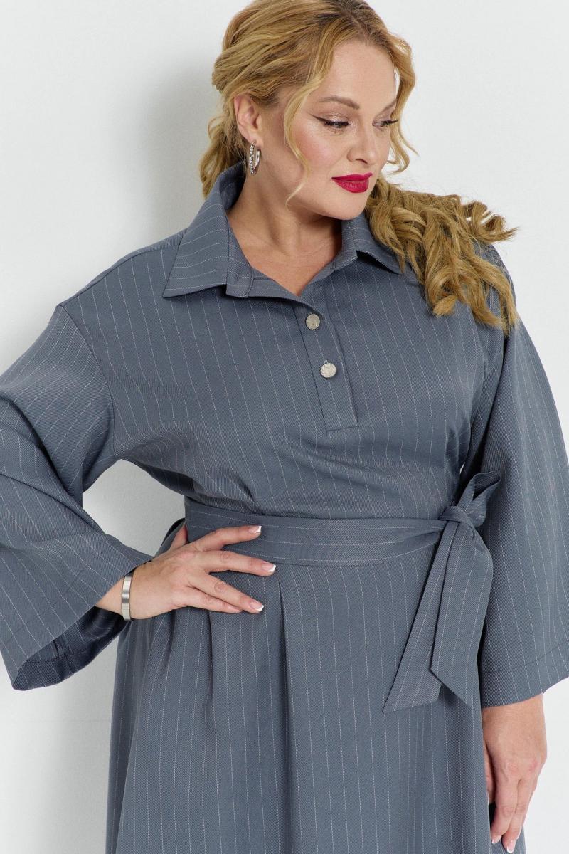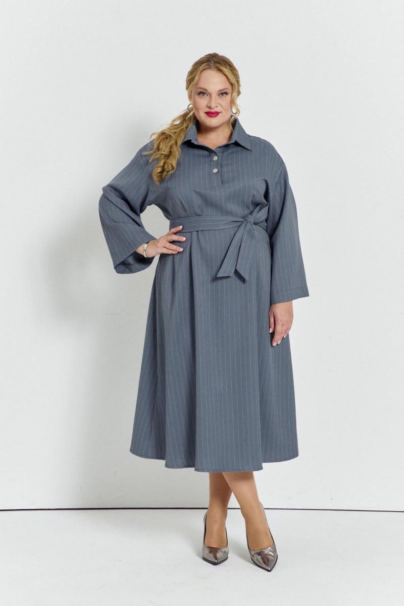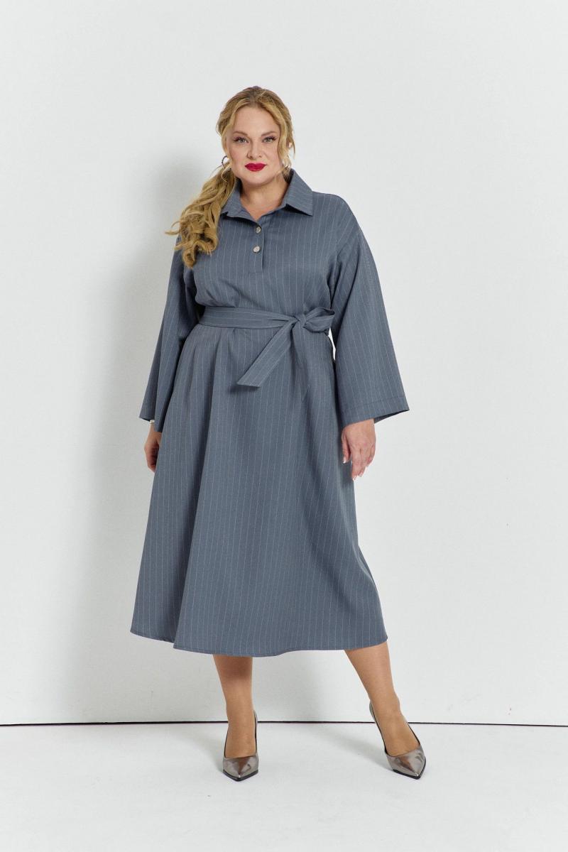 Платье полуприлегающего силуэта с широким разведением низа и мягкой линией плеча. В горловине обработан рубашечный воротник на отрезной стойке и застёжка поло на планке. Рукав одношовный ,широкий. В области талии на спинке и переде застрочены складки, формирующие силуэт. Платье можно дополнительно подвязать поясом. Длина по спинке от основания шеи ок.127см, длина рукава от нормали плеча ок. 62см.