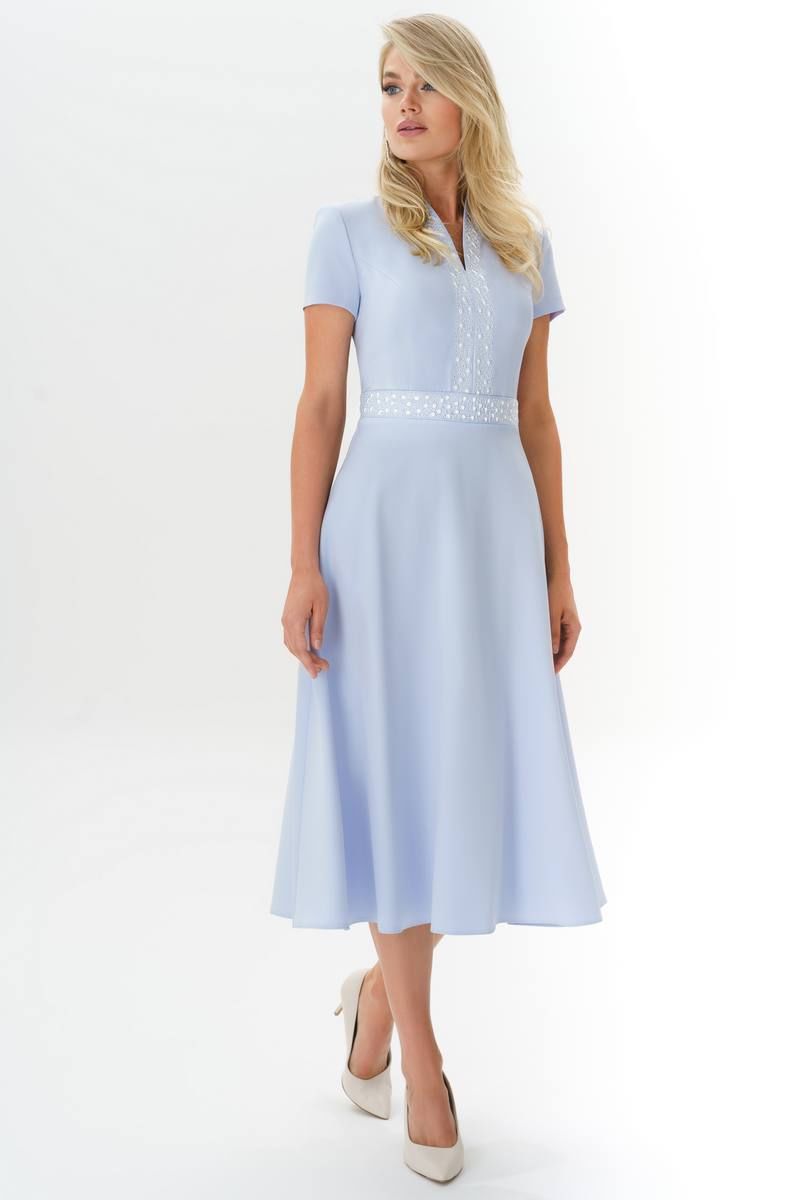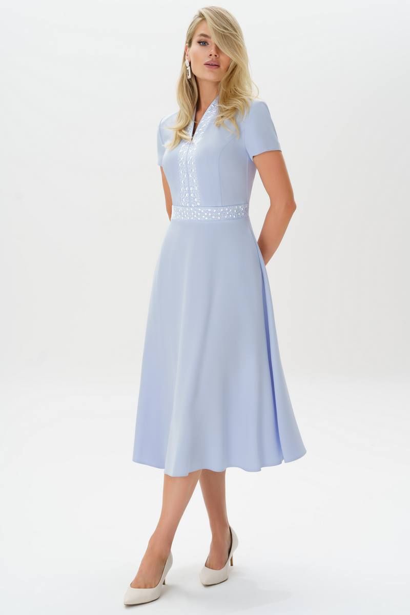 Летнее платья с дизайнерской вышивкой – это всегда восхитительные и женственные образы, позволяющие выглядеть роскошно и привлекательно. Платье женское из костюмно-плательной ткани, силуэта песочные часы, отрезное по линии талии с притачным поясом, длиной миди, с декоративной вышивкой.