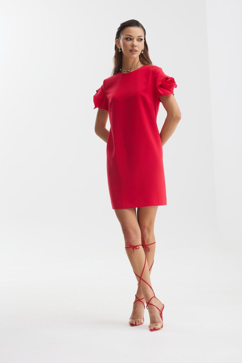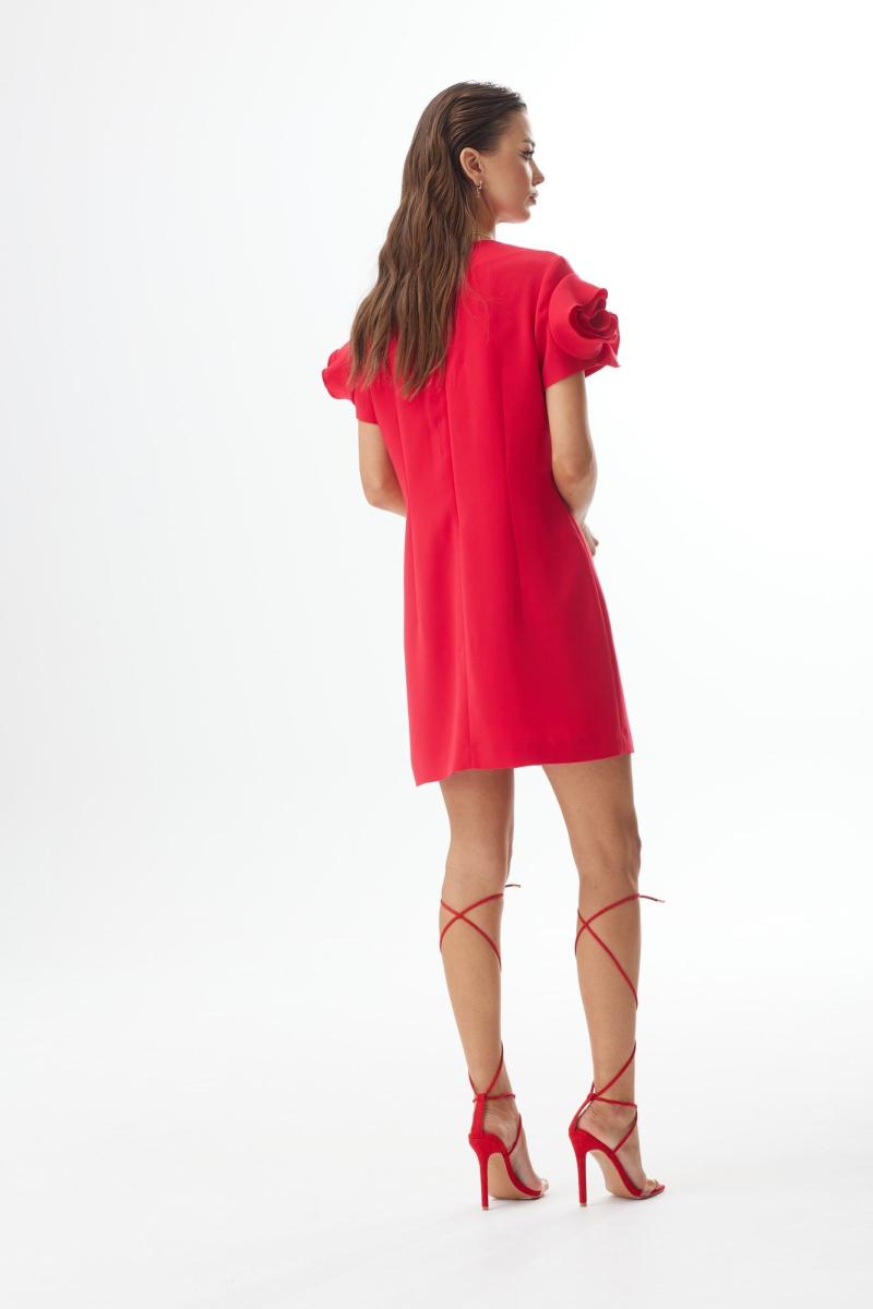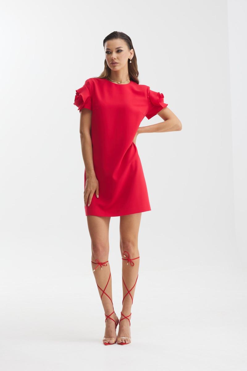 Платье полуприлегающего силуэта. Длина мини. Горловина круглой формы. Застежка по спинке на потайную молнию. Рукав короткий с декоративным элементом «роза». Платье на подкладке.