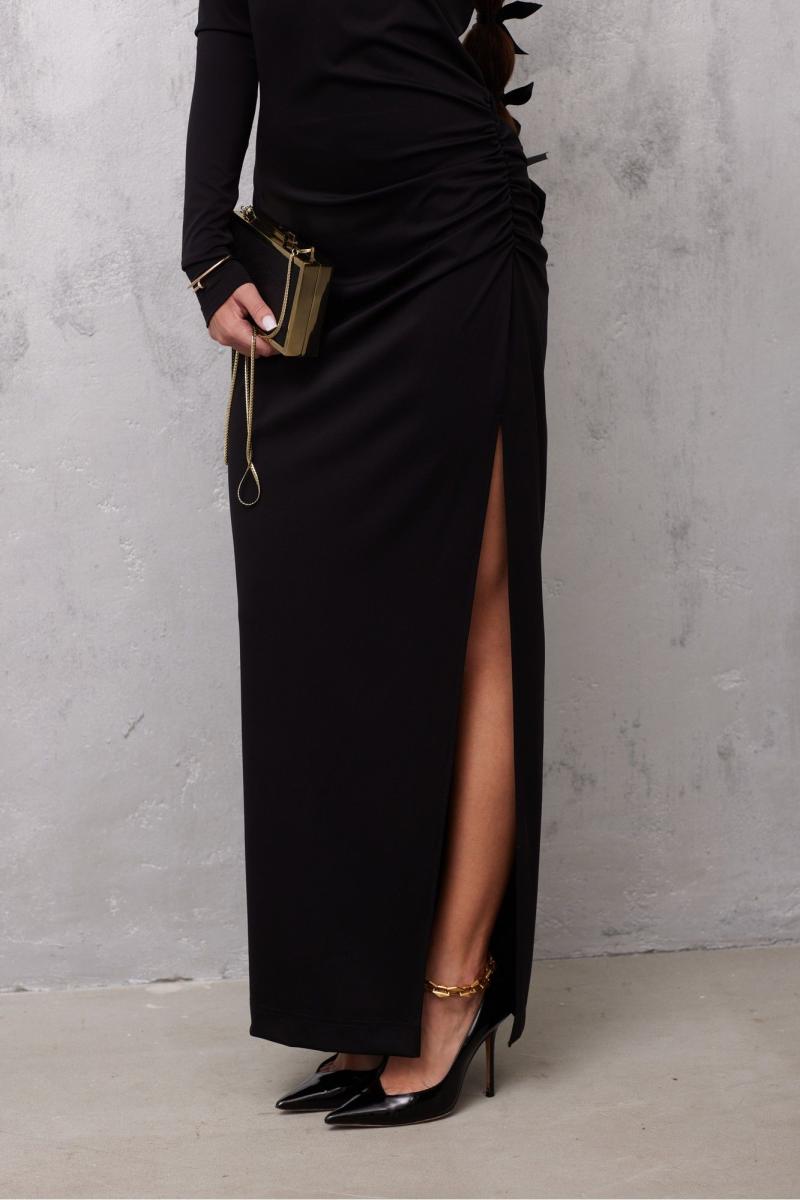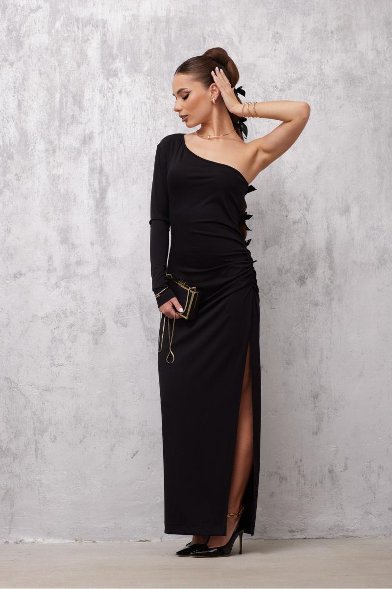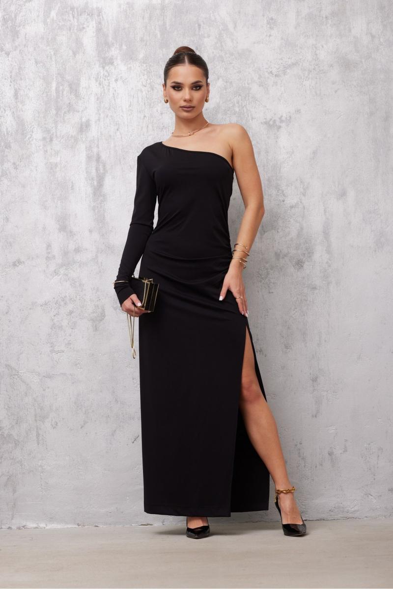 Платье прилегающего силуэта из трикотажного полотна. Длина макси. Платье на одно плечо. Рукав длинный, узкий. В боковом шве сборка и высокий разрез.  Длина платья 63 см. Измерения по готовому изделию 44 р-р: ОГ - 80 см., ОТ - 74 см., ОБ - 96 см. 46 р-р: ОГ - 84 см., ОТ - 78 см., ОБ - 100 см. 48 р-р: ОГ - 88 см., ОТ - 82 см., ОБ - 104 см. 50 р-р: ОГ - 92 см., ОТ - 86 см., ОБ - 108 см. 52 р-р: ОГ - 96 см., ОТ - 90 см., ОБ - 112 см.
