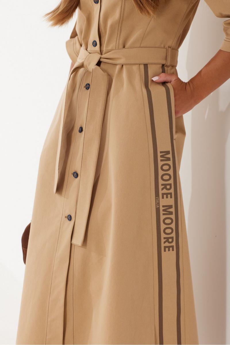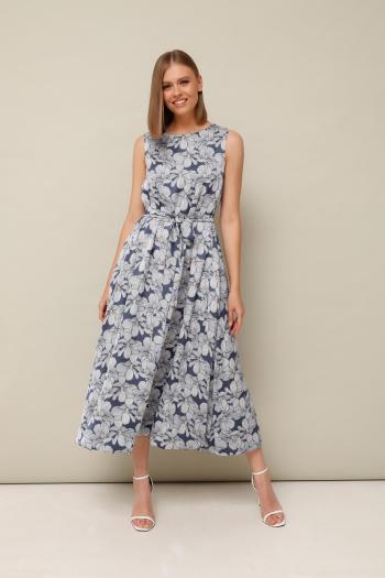 Платье из ткани «джинс». Длина миди. Застежка по переду на петли и пуговицы. Отрезная линия талии. На переде накладные карманы с клапаном. Рукав ¾ прямой, длина регулируется патой. Воротник рубашечный. В боковых швах юбки карманы. На боковых частях юбки нанесена печать. В комплекте завязывающийся пояс.