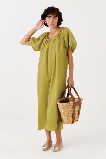 Платье из хлопковой ткани «ришелье». Длина миди. Вырез горловины V-образный по переду и спинке. Застежка по спинке на потайную молнию. Рукав цельнокроеный с открытым плечом. По талии пояс-кокетка с декоративной сборкой и завязками. По низу переда разрезы. Платье на подкладке.  Длина рукава 45 см. Длина платья 128 см. Длина спинки до талии - 46 см. Длина подкладки от талии - 46 см. Измерения по готовому изделию 44 р-р: ОГ - 94 см., ОТ - 84 см., ОБ - 102 см. 46 р-р: ОГ - 98 см., ОТ - 88 см., ОБ - 106 см. 48 р-р: ОГ - 102 см., ОТ - 92 см., ОБ - 110 см. 50 р-р: ОГ - 106 см., ОТ - 96 см., ОБ - 114 см. 52 р-р: ОГ - 110 см., ОТ - 100 см., ОБ - 118 см.