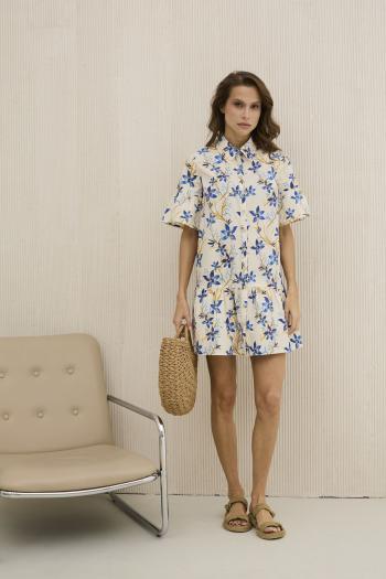 Платье женское полуприлегающего силуэта с легким расклешением к низу. Ткань сложного переплетения со структурными декоративными незначительными просветами. Рисунок создан непосредственно при изготовлении ткани. Нижняя часть платья на хлопковой подкладке. Центральная бортовая застежка на петли пуговицы. Воротник блузочный на отрезной стойке. Рукав цельнокроеный с декоративными складками по линии плеча . В боковых швах карманы. Имеется навесной отделочный пояс. В боковых швах вставлены шлевки для поддержания навесного пояса.
