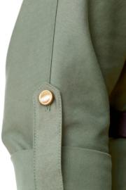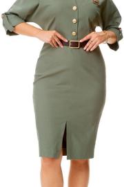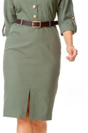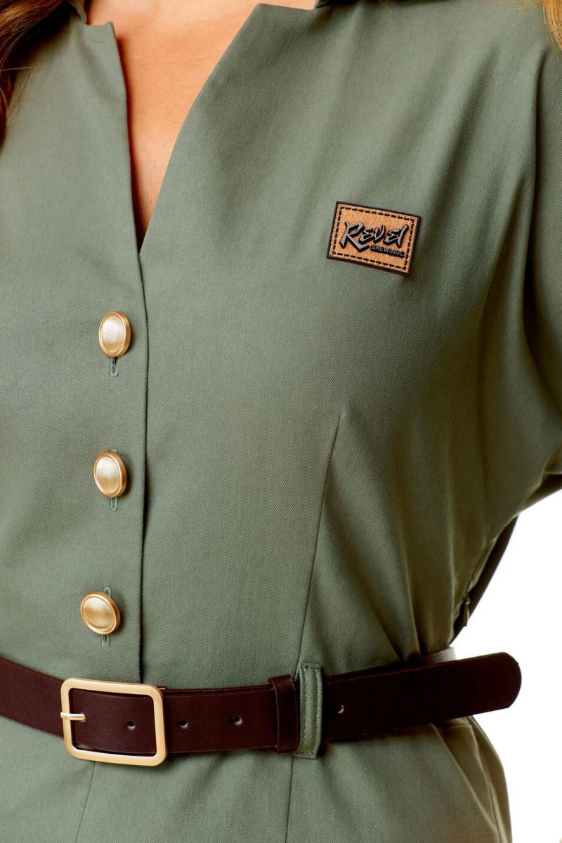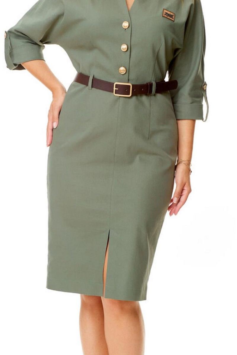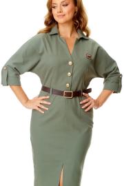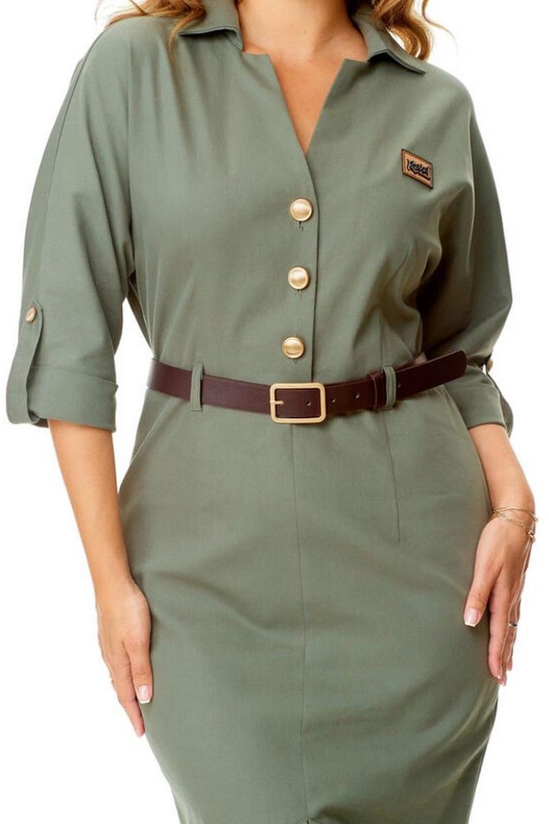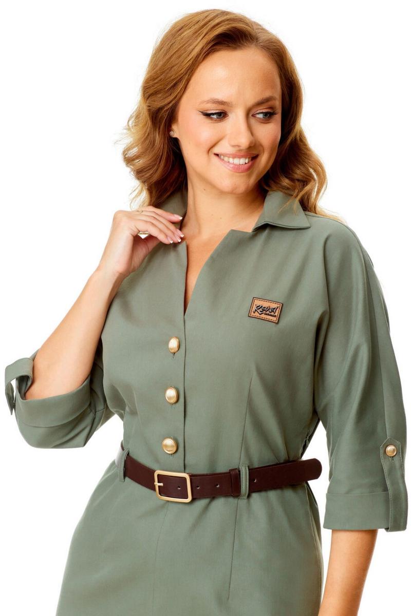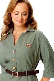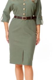 Платье женское полуприталенного силуэта, заужено к низу. Рукав цельнокроеный типа "летучая мышь" длиной 3/4. Низ рукава с отложной манжетой и патой. Горловина обработана блузочным воротником на отрезной стойке. Спинка со средним швом и вытачками. В боковом шве застежка на потайную тесьму-молнию. Перед до линии талии с однобортной застежкой на петли-пуговицы. Низ переда с разрезом. Имеется отделочный навесной пояс контрастного цвета. Для поддержания пояса имеются шлёвки.