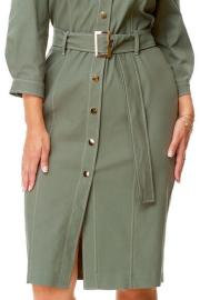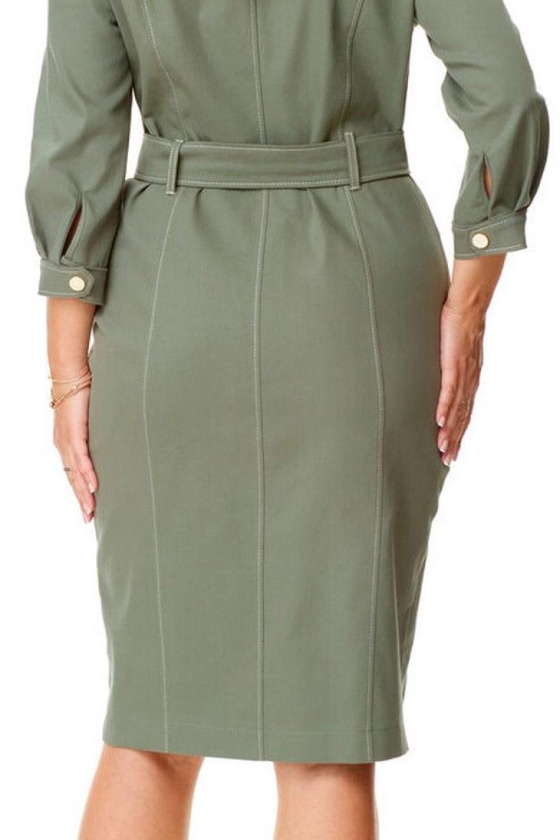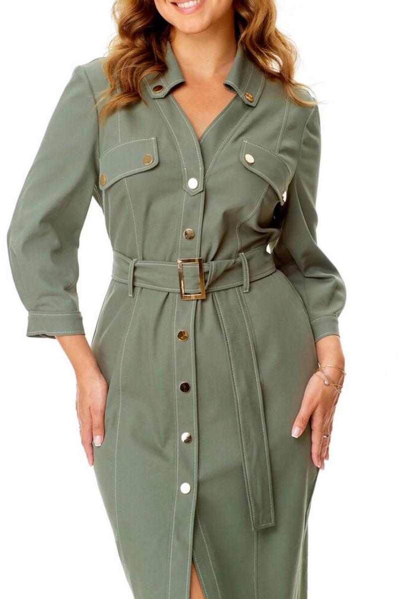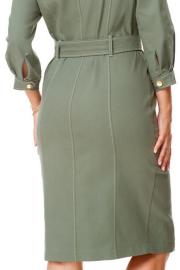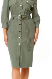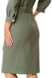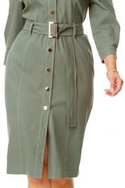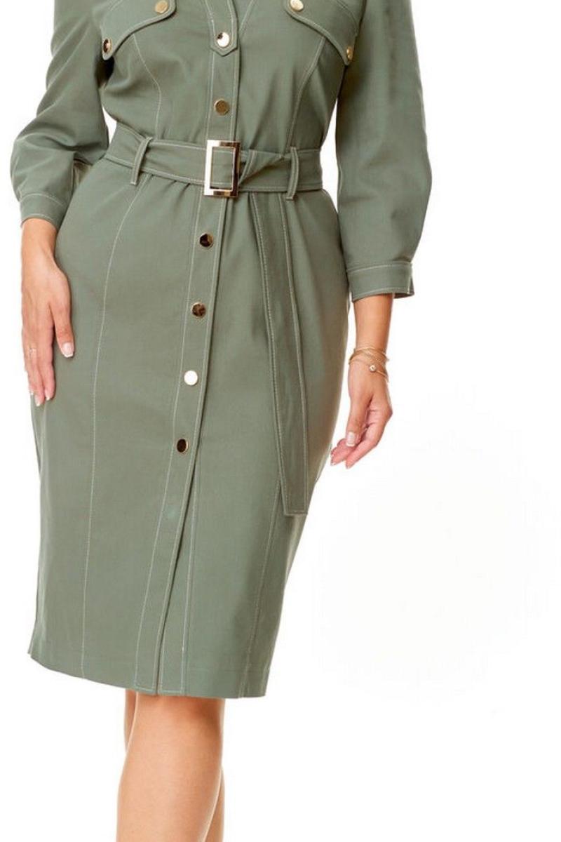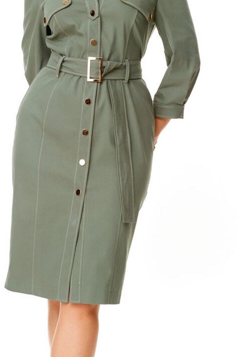 Платье женское полуприталенного силуэта зауженное книзу. Центральная бортовая застёжка с планкой на кнопки. Полочка и спинка с рельефами и отделочными строчками. Полочка с накладными клапанами с застёжкой на кнопки. Воротник на отрезной стойке блузочного типа. Отлет воротника обработан планкой с застёжкой на кнопки. Рукав втачной одношовный. Низ рукава с манжетой и складками. Манжета с застёжкой на кнопку. Имеется навесной пояс с отделочной пряжкой. Для поддержания пояса имеются шлёвки.
