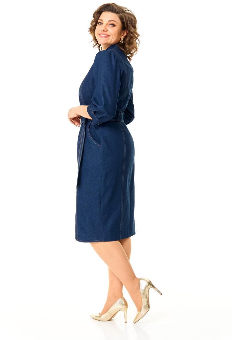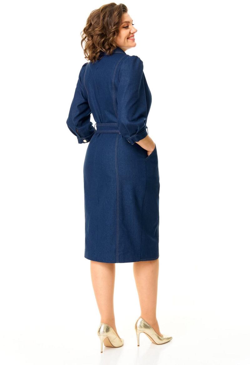 Платье женское полуприлегающего силуэта, заужено к низу. Центральная бортовая застёжка на кнопки. Перед и спинка с рельефами и отделочными строчками. Низ борта имеет оригинальную закругленную форму. По переду имеются карманы с отрезным бочком. Воротник пиджачного типа. Рукав втачной одношовный с легкой сборкой по окату. Плечевой пояс для придания изящества слегка заужен. Низ рукава с манжетой и складками. Манжета с застёжкой на кнопку. Имеется навесной пояс с отделочной пряжкой. Для поддержания пояса имеются шлёвки.
