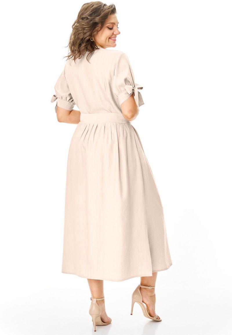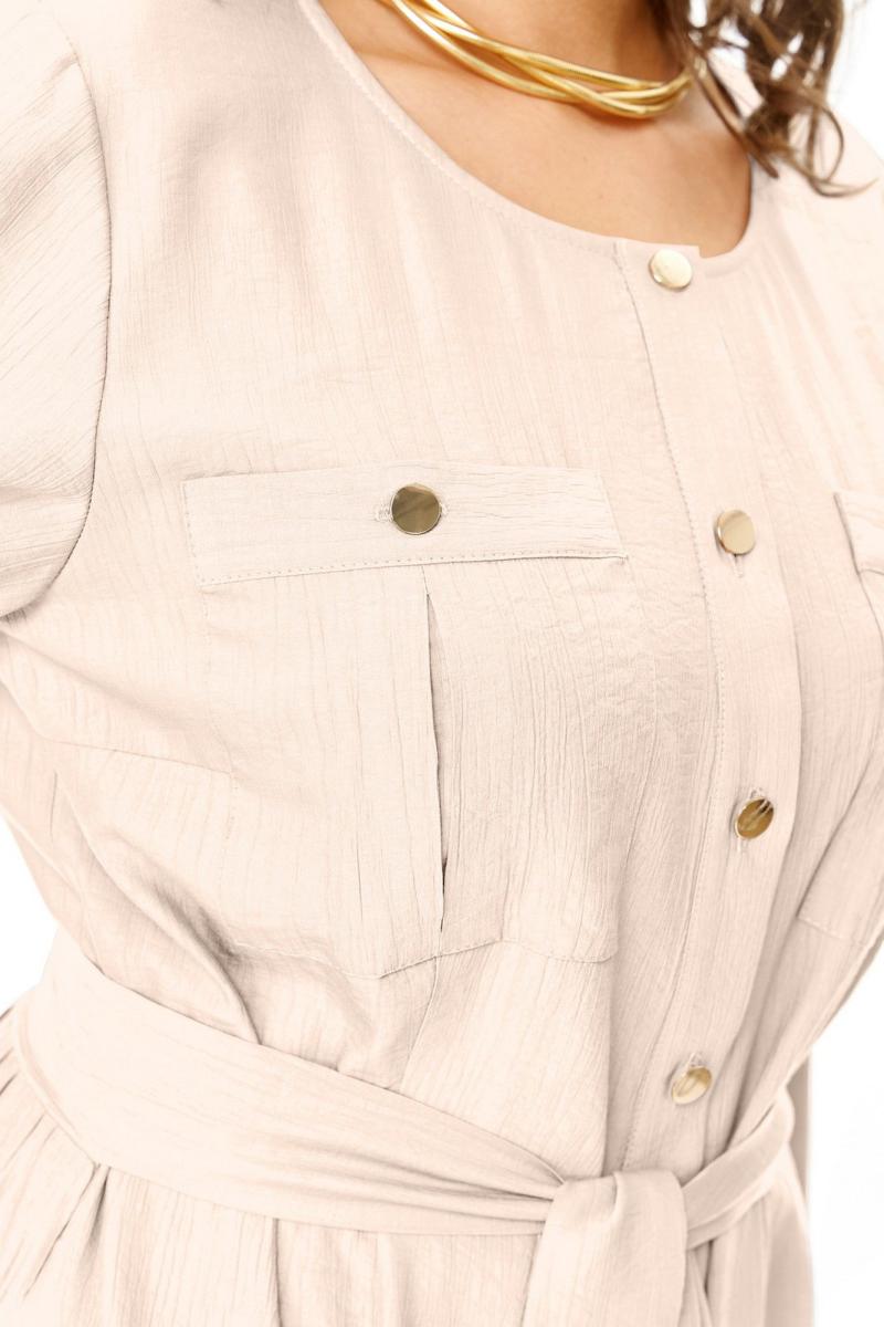 Платье женское свободного покроя с легким расклешением к низу и естественной линией плеча.Рукав втачной с разрезом в верхнем шве и манжетой переходящей в завязки.Горловина округлой формы.Перед с отрезной планкой, застежкой на петли-пуговицы, вытачками переходящими в складку и нагрудными карманами.Спинка с подрезом ниже линии талии, сборкой в нижней части и втачным поясом переходящим в завязки.В боковых швах обработаны карманы.