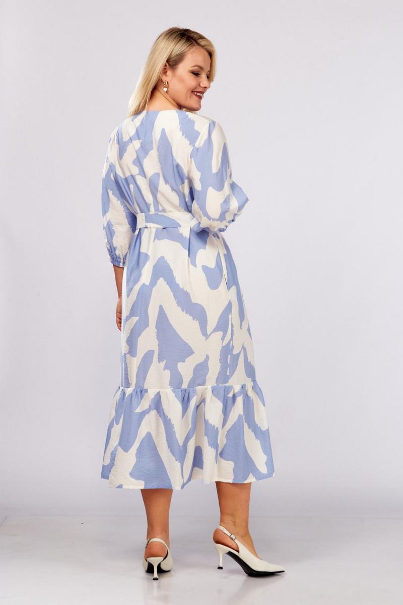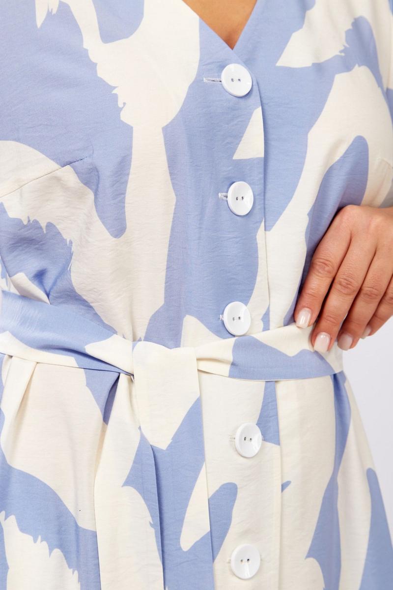 Платье женское А-образного силуэта с естественной линией плеча.Рукав втачной длиной 3/4. Низ рукава обработан резинкой.Горловина V-образной формы.Перед с нагрудной вытачкой и застежкой на петли-пуговицы.По низу переда и спинки обработана оборка.В боковых швах обработаны карманы.В комплект входит съемный пояс.