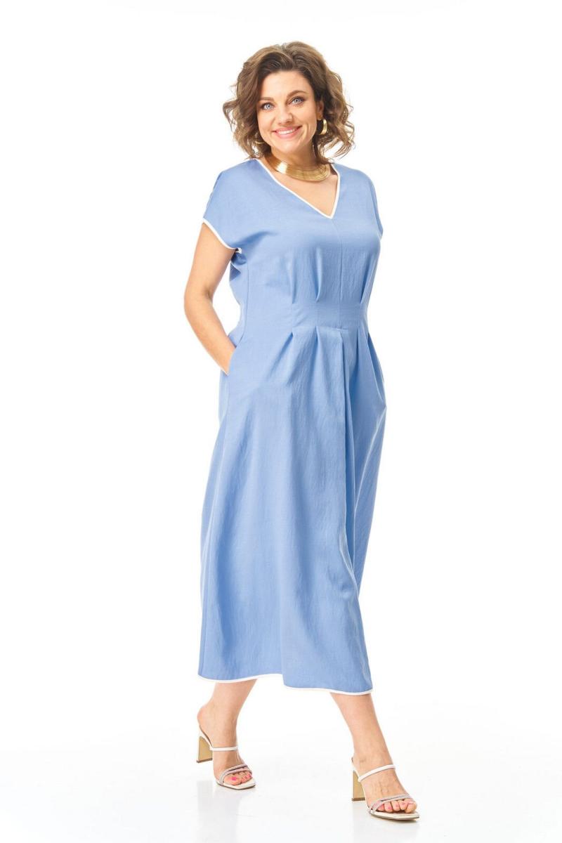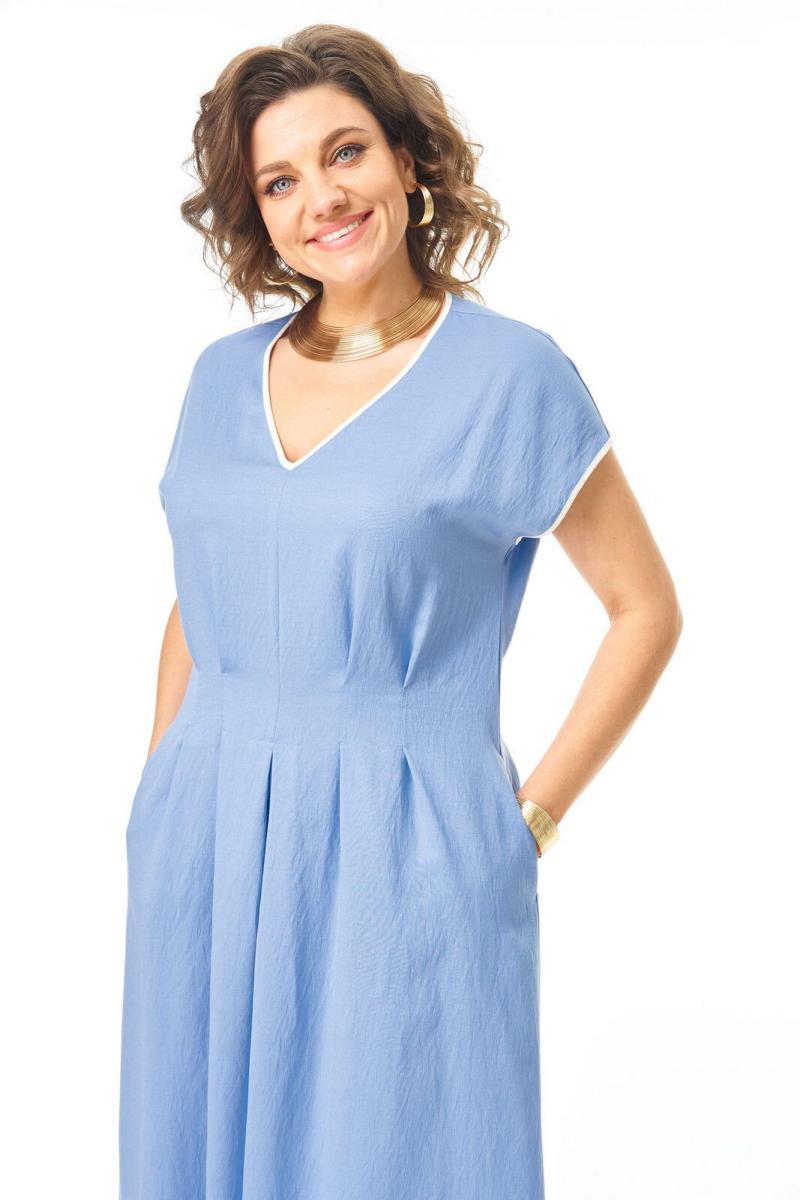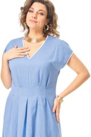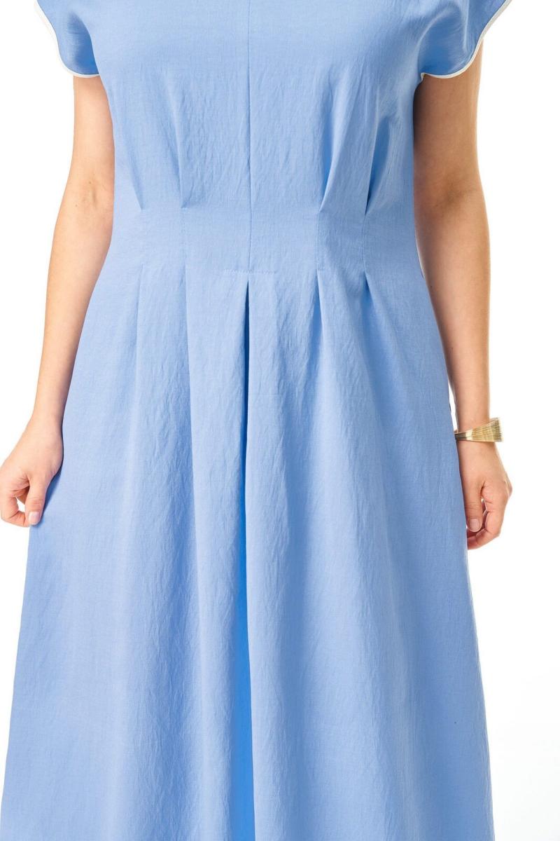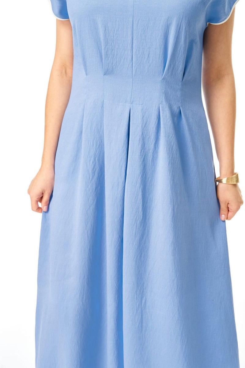 Платье женское полуприлегающего силуэта расширенное к низу со спущенной линией плеча.Рукав типа "летучая мышь".Горловина V-образной формы.В среднем шве спинки застежка на тесьму-молнию.По переду и спинке для придания прилегания застрочены складки.В боковых швах обработаны карманы.Горловина, низ рукава и платья окантованы тканью контрастного цвета.