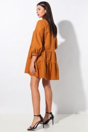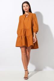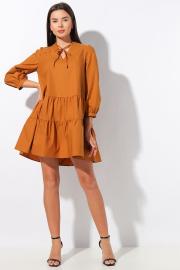Платье женское, свободного кроя, выполнено из хлопкового полотна. Горловина овальная со стойкой и V-образным вырезом с декорированными завязками. Передняя и задняя часть платья - двумя отрезами и мелкой сборкой по всему изделию. Спинка из двух частей со швом посередине.   Рукав втачной присборенный по окату и низу с притачной манжетой, застегивающейся на пуговицу.   Длина изделия:  84см.   Длина рукава: 52см.   Уход: ручная стирка при температуре не выше 30 С