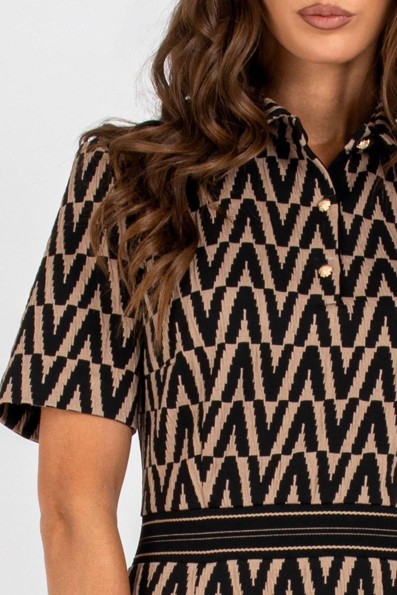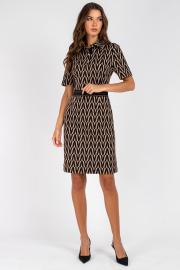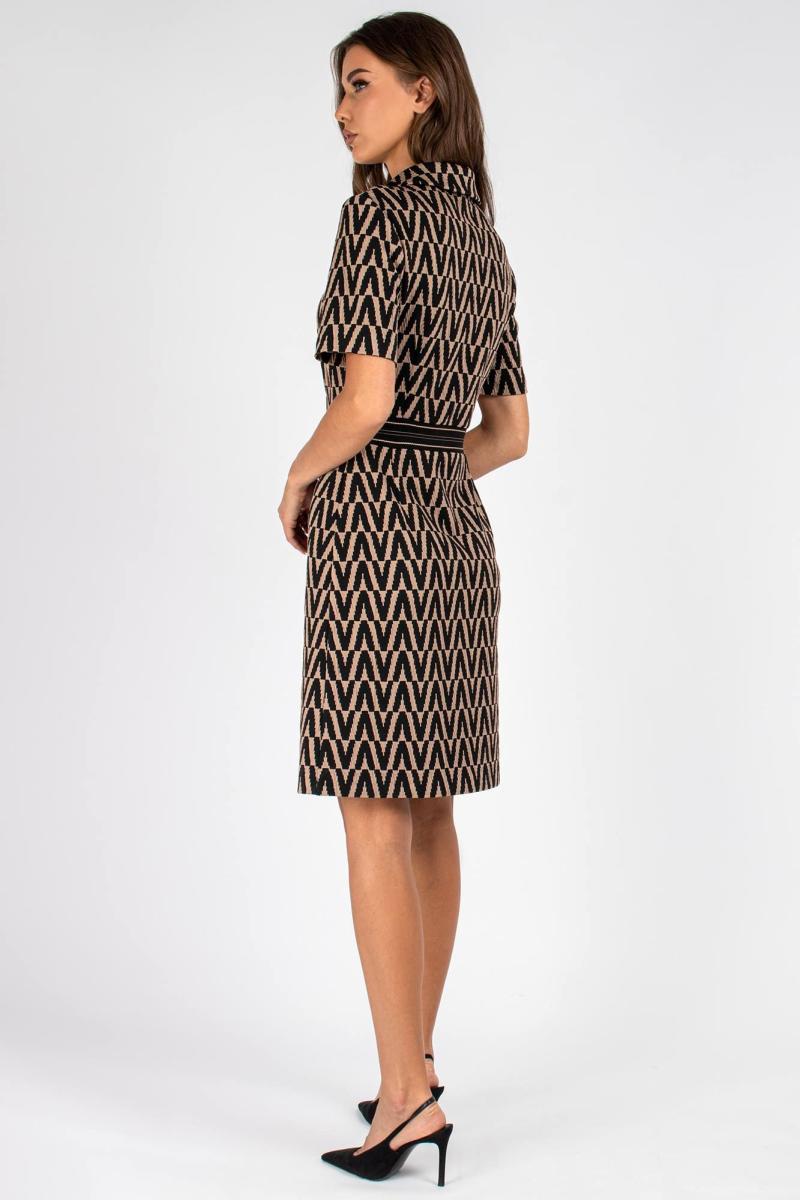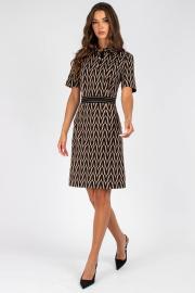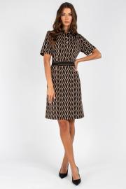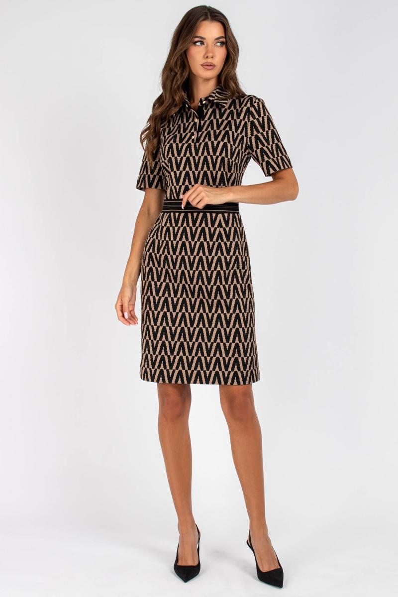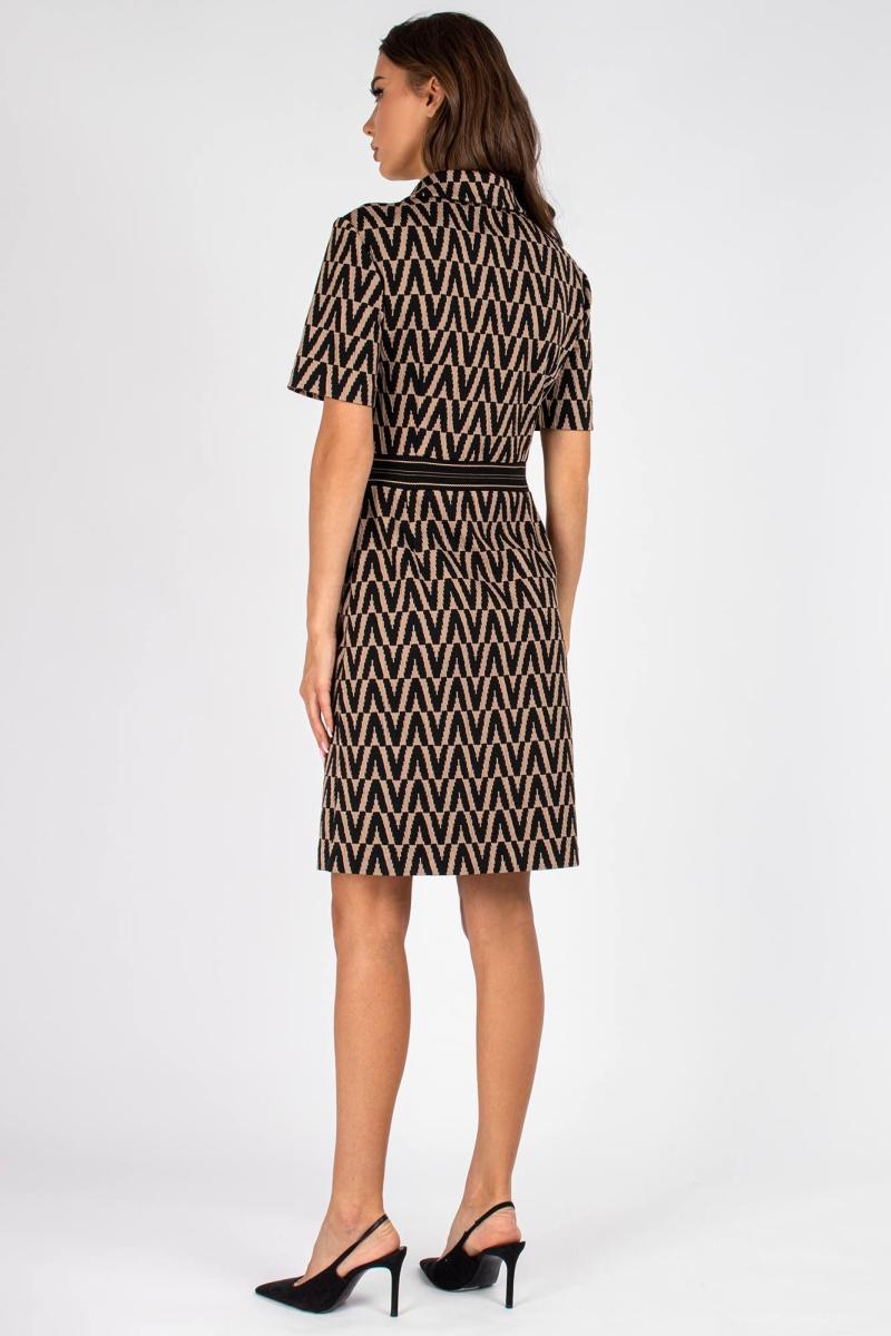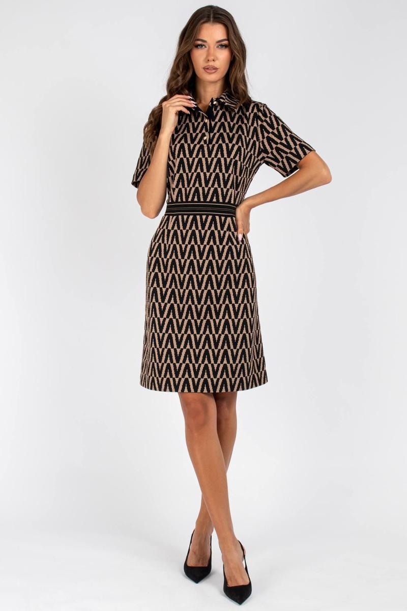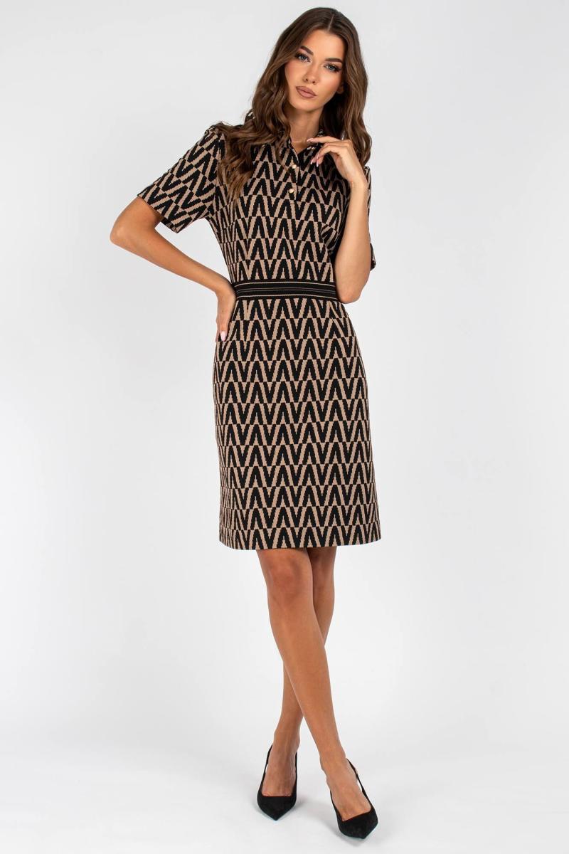 Платье женское полуприлегающего силуэта, отрезное по линиям талии.  Линия талии с отделочной эластичной тесьмой.  На полочке застежка на петли и пуговицы.  Рукав втачной короткий.  Изделие отлично садиться на фигуру благодаря хорошей эластичности ткани. Длина изделия 44, 46, 48: 96 см. Длина изделия 50, 52, 54: 101 см. Уход: бережная стирка при температуре не выше 30°С.