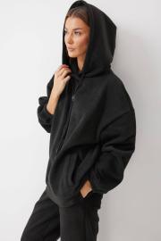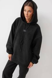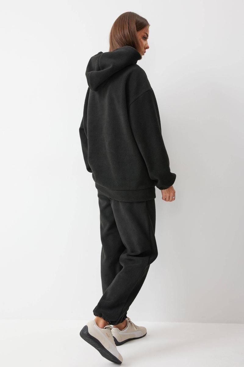 Костюм состоящий из джемпера и брюк. Джемпер прямого силуэта из комфортного трикотажного полотна. Горловина обработана капюшоном. Рукав со спущенной линией плеча, по низу на резинке. По низу джемпера притачной пояс. По переду декоративная нашивка и шнур.
