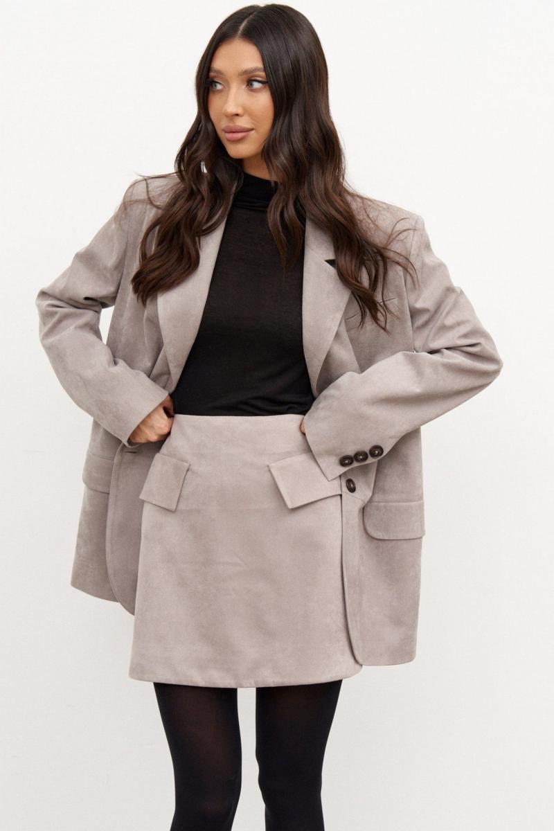 Юбка выполнена из мягкой ткани светло-серого цвета (искусственная замша). Характеристики: полуприлегающий А-образный силуэт, подкладка, застежка - потайная тесьма молния в среднем шве заднего полотна, по переду имитация карманов с клапаном. Длина по поковому шву 43 см.