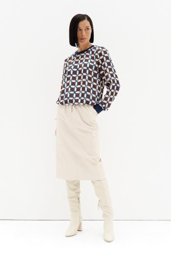 Юбка выполнена из мягкой ткани серо-коричневого цвета (искусственная замша). Характеристики: полуприлегающий А-образный силуэт, подкладка, застежка - потайная тесьма молния в среднем шве заднего полотна, по переду имитация карманов с клапаном. Длина по поковому шву 43 см.