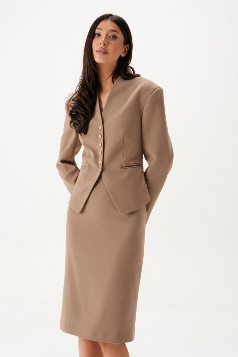Юбка карандаш, выполнена из костюмной ткани в цвете капучино. Характеристина: полуприлагающий силуэт, подклад, пояс стабильный, на обтачке. По передней части изделия выточки. В среднем шве задней части изделия разрез 25 см. Застёжка потайная тесьма молния в среднем шве задней части изделия. Длина юбки по боковому шву 65 см.