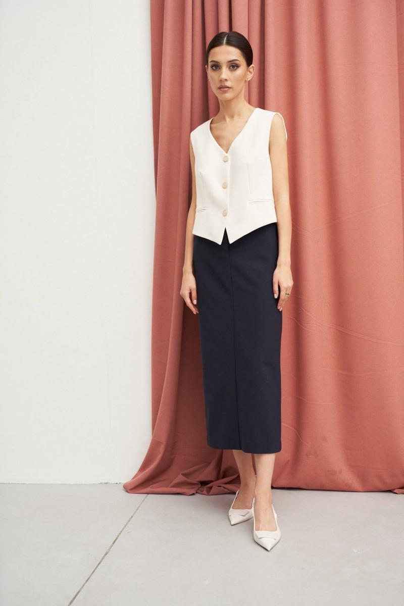 Юбка полуприлегающего силуэта выполнена из костюмной ткани глубокого синего цвета. Характеристики: полуприлегающий силуэт, подкладка, пояс притачной, застежка на пуговицу и молнию по переду изделия.