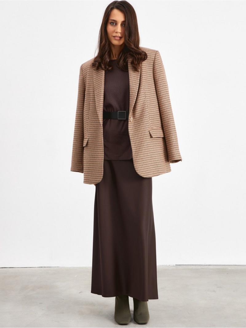 Юбка А-образного силуэта, свободная к низу изделия, выполнена в глубоком коричневом цвете. Юбка на поясе, сбоку изделия потайная молния.