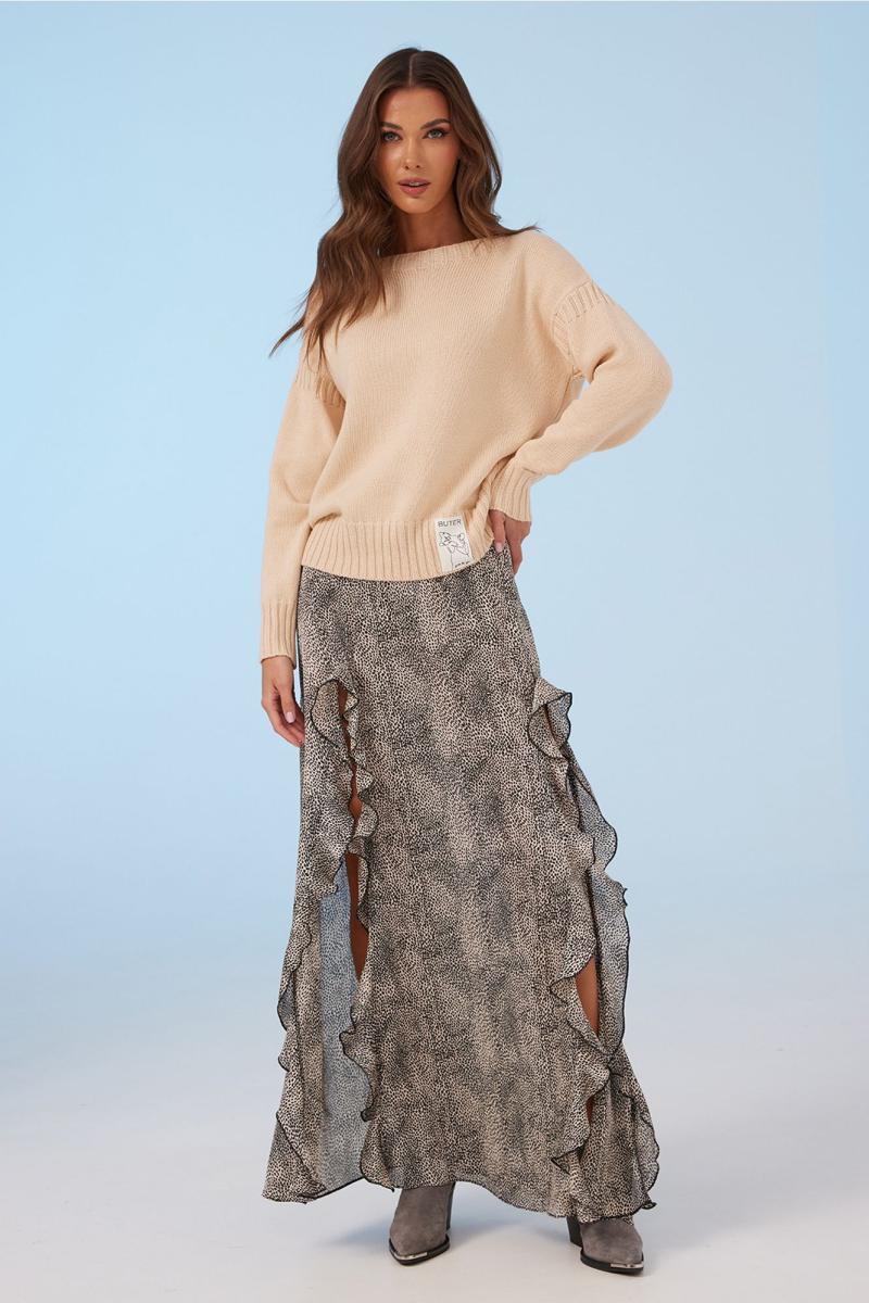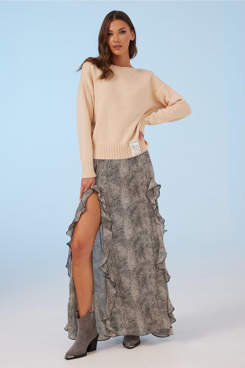Юбка А-образного силуэта длинная на притачном отстроченном поясе на резинке. По переду высокие разрезы, в которые вставлены воланы. Юбка без подкладки.