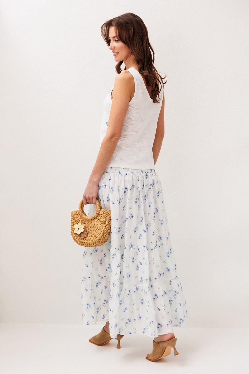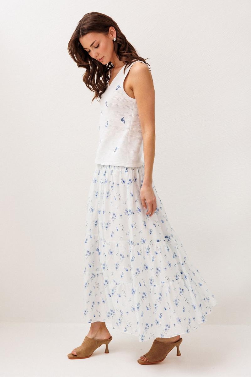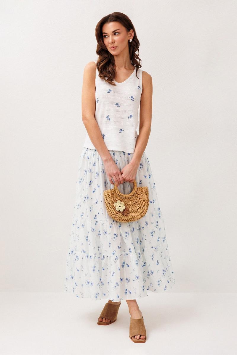 Юбка шифоновая А-силуэта на резинке с притачной кокеткой, которая отстрочена резинками. Юбка с 2-мя притачными слегка присборенными воланами. Юбка на подкладке.