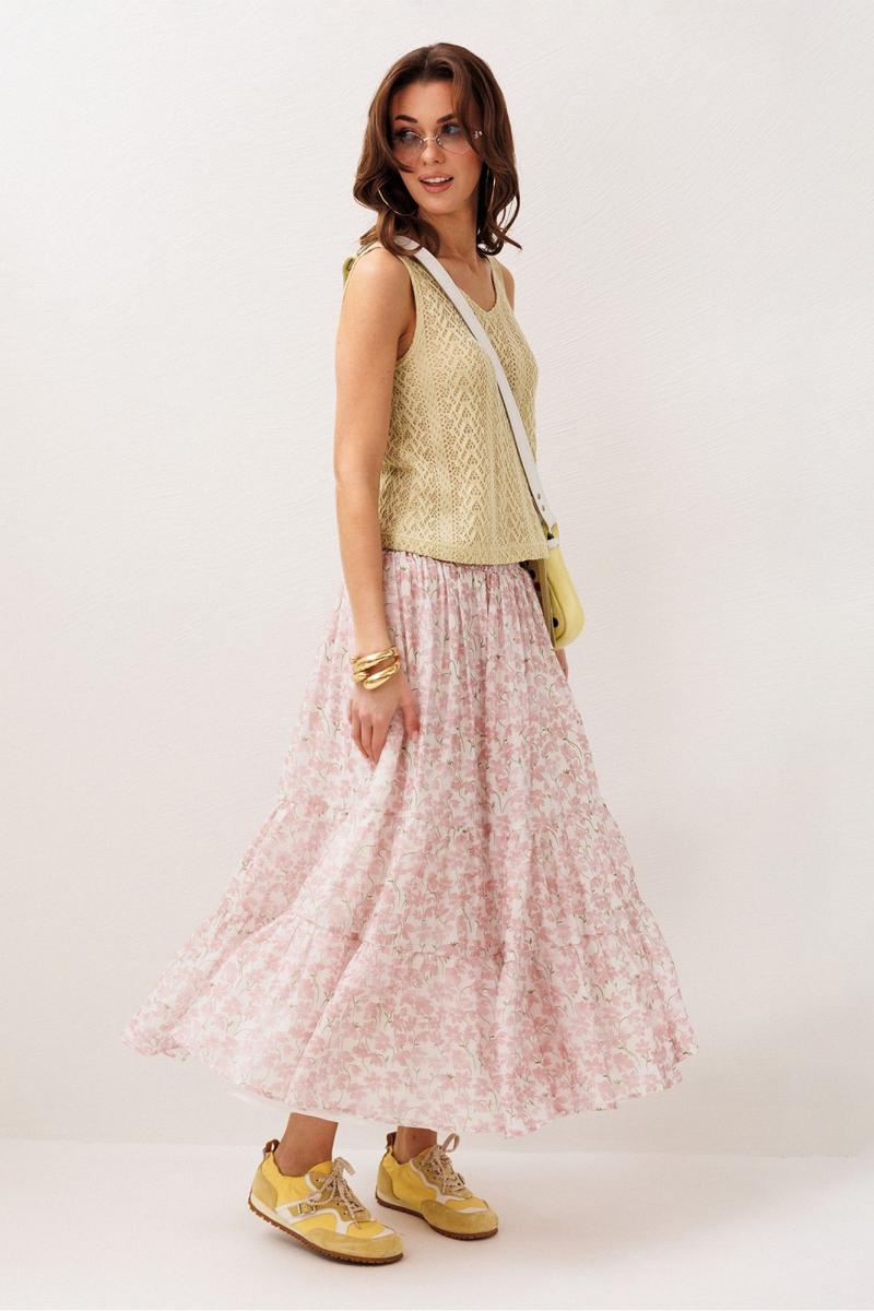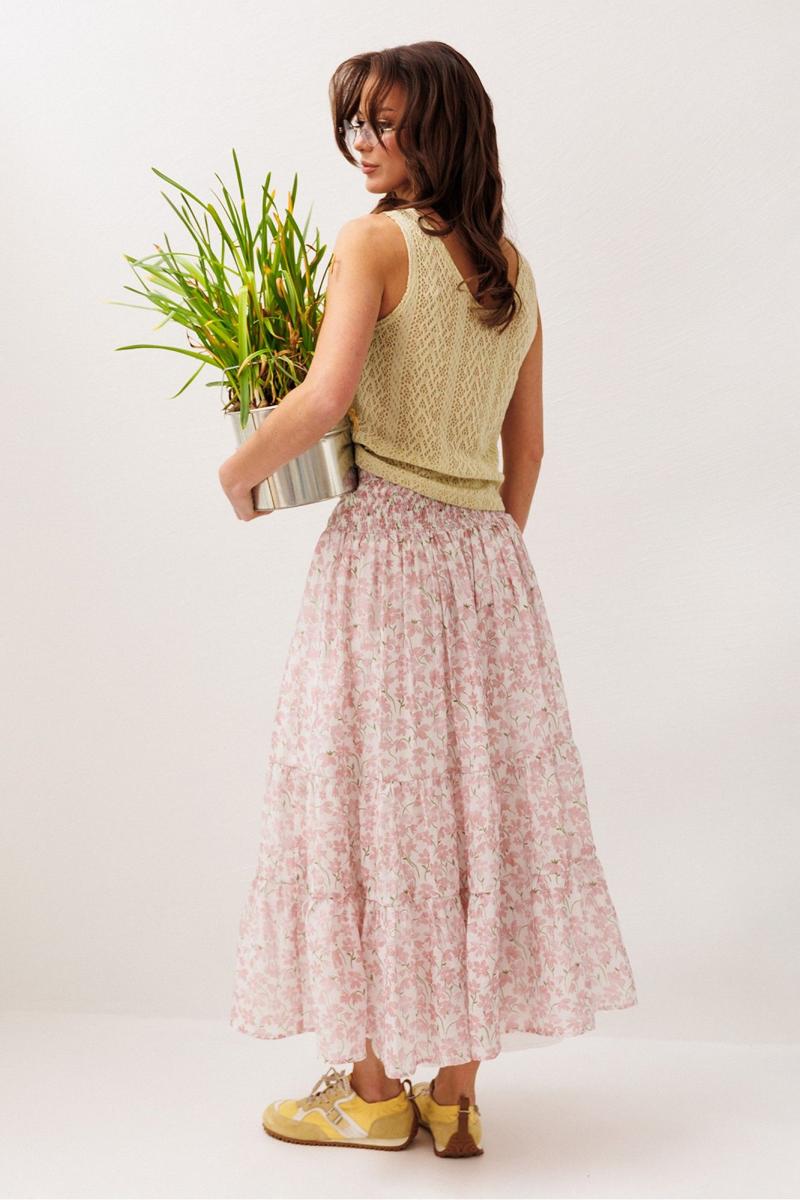 Юбка шифоновая А-силуэта на резинке с притачной кокеткой, которая отстрочена резинками. Юбка с 2-мя притачными слегка присборенными воланами. Юбка на подкладке.