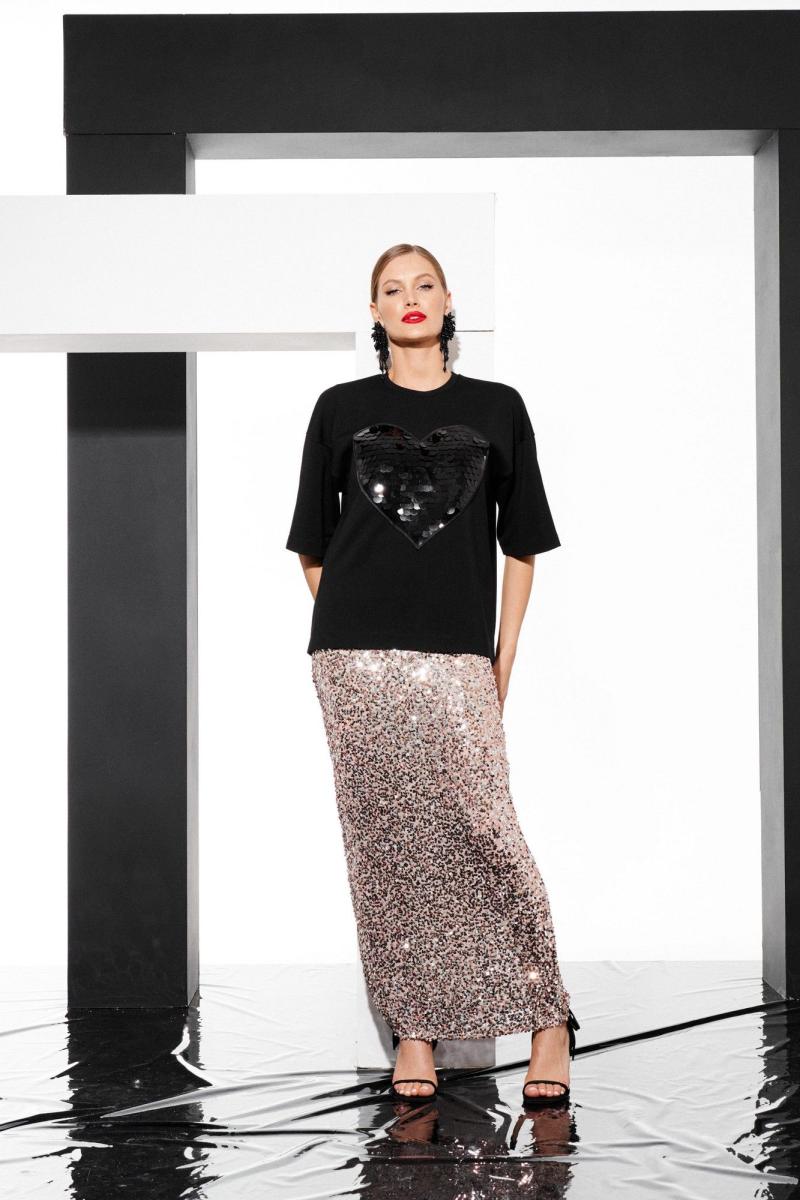Юбка женская, приталеного силуэта, длиной до линии щиколотки из трикотажного полотна в пайетки. Юбка без разреза, на подкладке до середины бедра. По поясу вставлена эластичная тесьма.