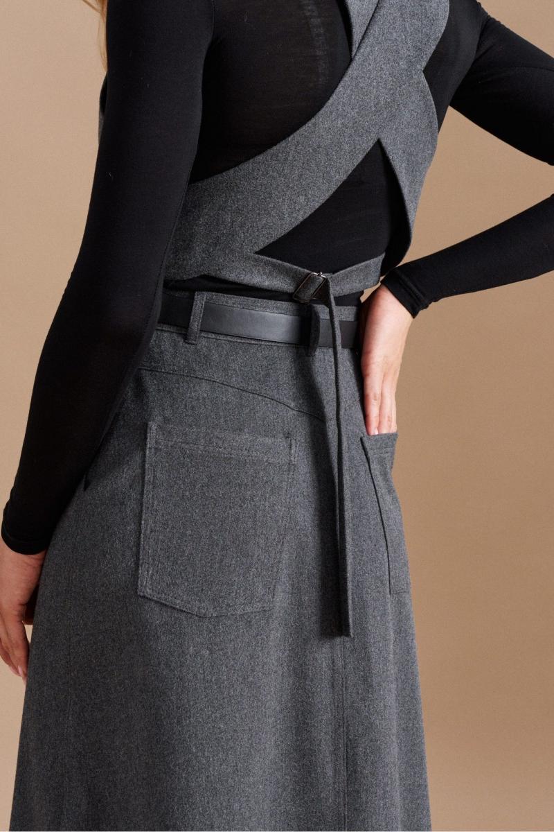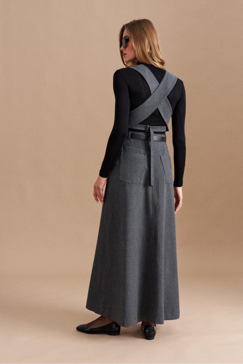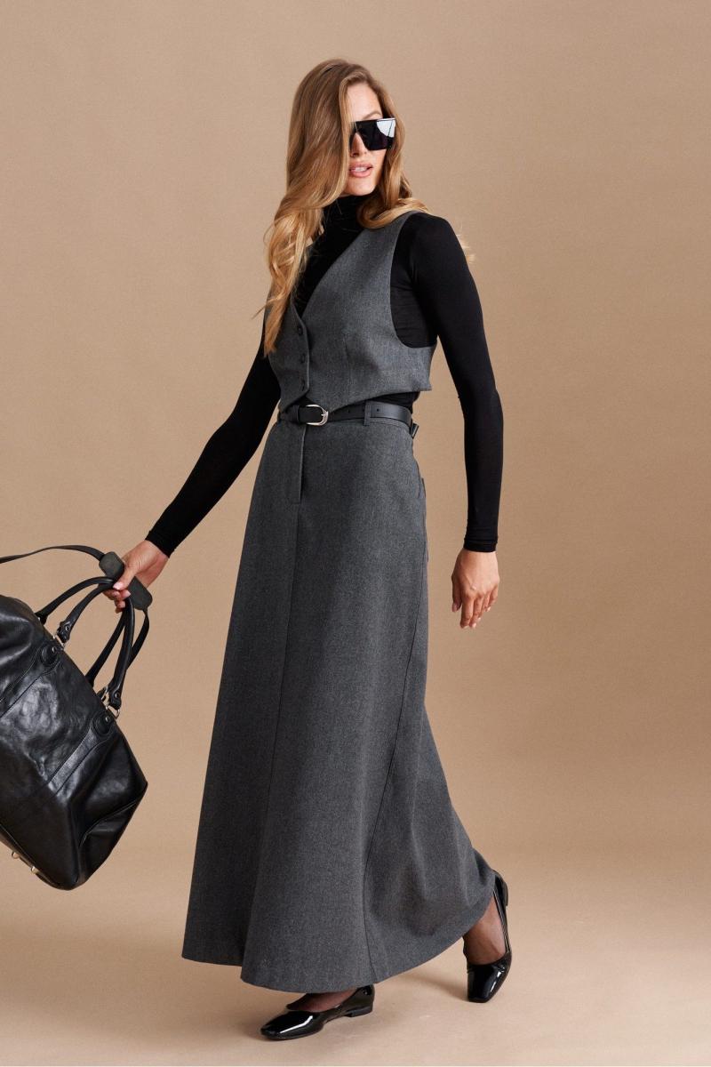 Юбка силуэта трапеция из костюмной ткани длиной макси. Изделие на поясе. Перед со средним швом, прорезными карманами в боковых швах. Спинка со средним швом, отрезной кокеткой, накладными карманами.
