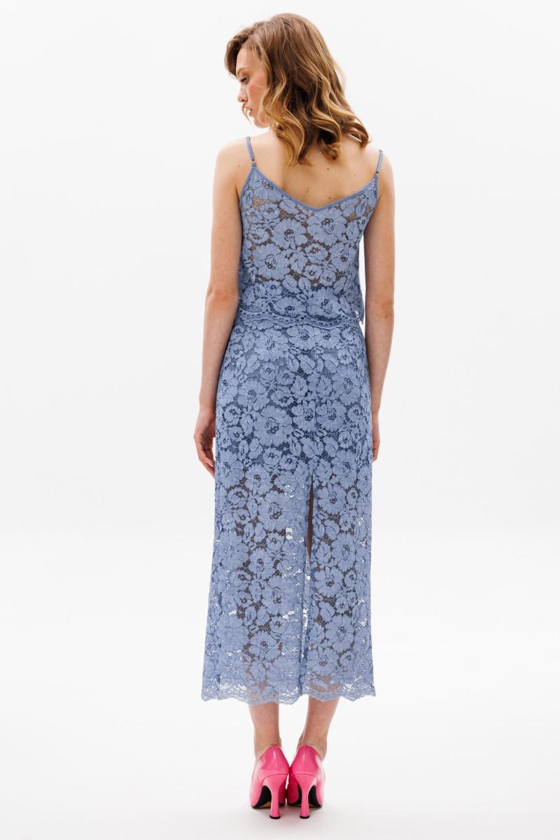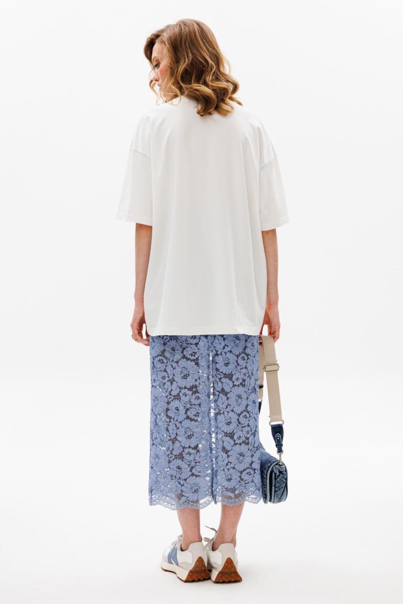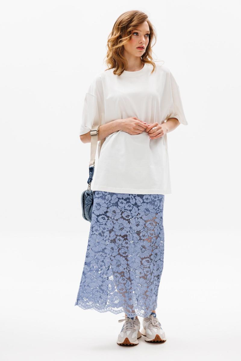 Юбка выполнена из гипюра. Юбка прямого силуэта длиной миди, на притачном поясе. На заднем полотнище в среднем шве застежка на потайную молнию. Пояс застегивается на петлю и пуговицу. По низу юбки фестоны. Юбка на короткой отлетной по низу подкладке.