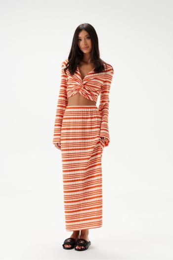 Юбка выполнена из плательной ткани. Юбка А-образного силуэта, длиной миди. Юбка на притачном поясе. Сзади в среднем шве застежка на потайную молнию. В боковых швах карманы с наклонным входом. Юбка декорирована по низу переда вышивкой с перфорацией.